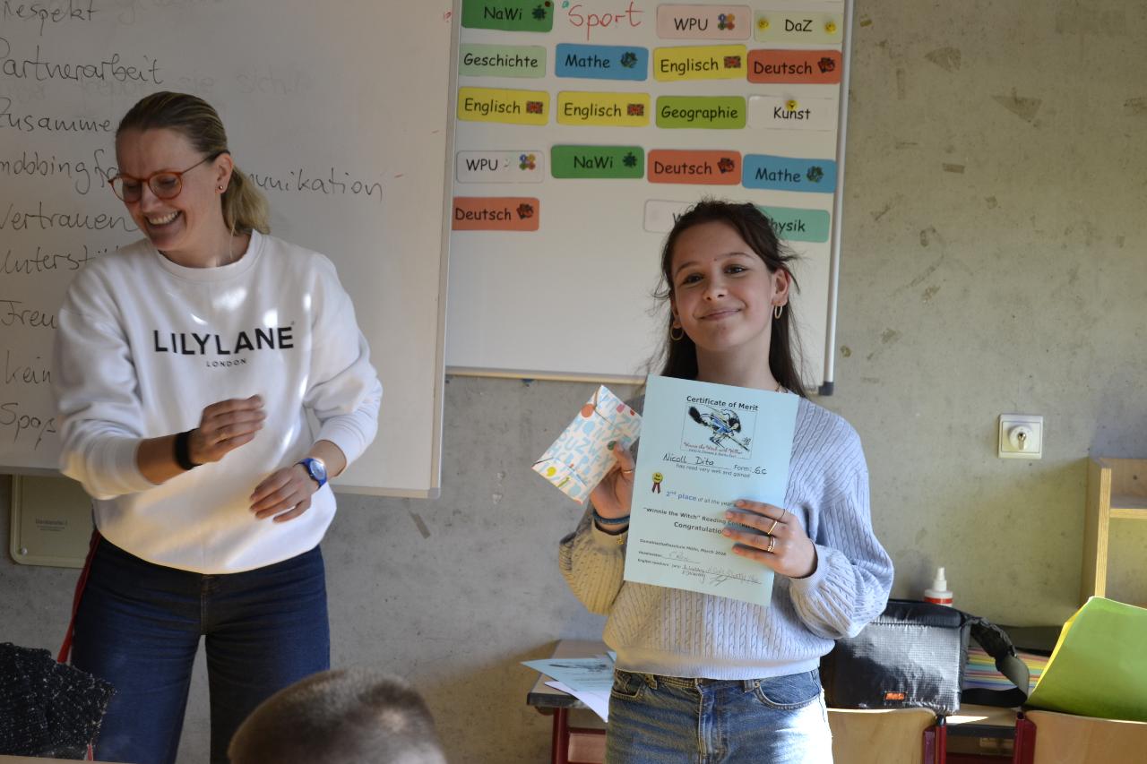 Der dritte Preis ging an Tyler Lennox Rockhoff (6e).Die Gewinner erhielten nicht nur großen Applaus, sondern auch Urkunden und – ganz nach dem Motto “READING IS FUN!“ – einen Gutschein der Möllner Buchhandlung „Weber“.