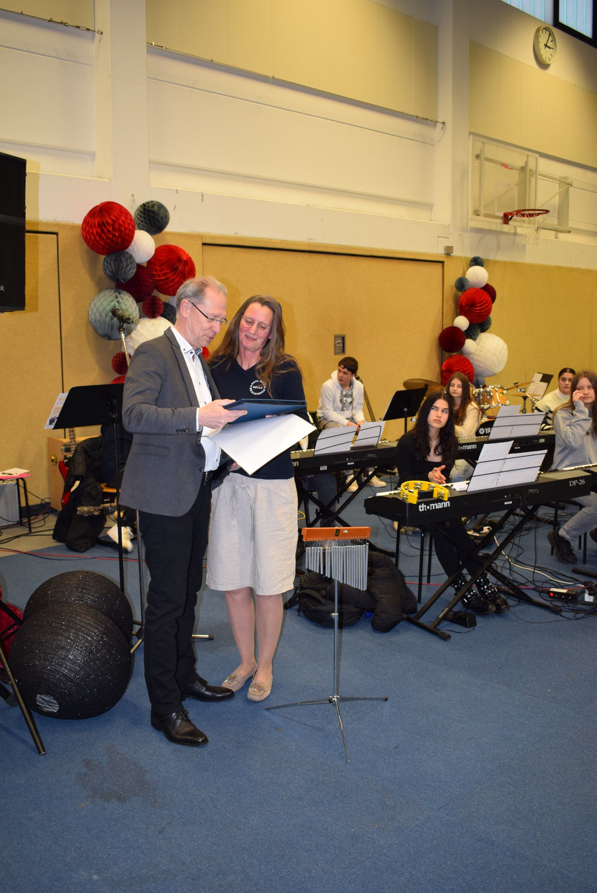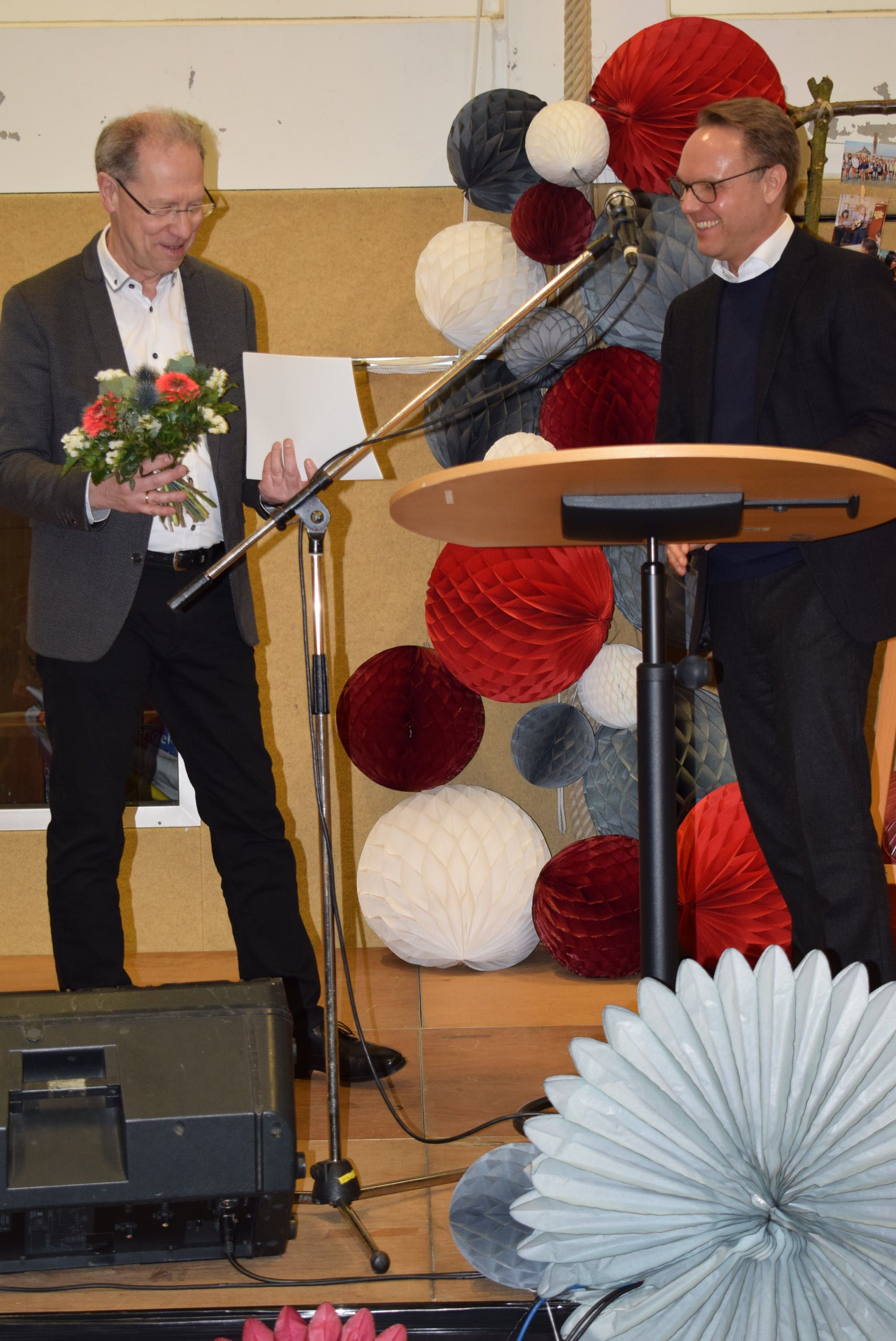 Als ehemalige Weggefährten der vorherigen Wirkungsstätte von Herrn Dr. Schmidt fanden die ehemalige stellvertretende Schulleiterin und der jetzige Schulleiter der Fürstin Ann-Mari-von-Bismarck-Schule in Aumühle, Frau Carmen Giesen und Herr Stefan Platte lobende Worte.