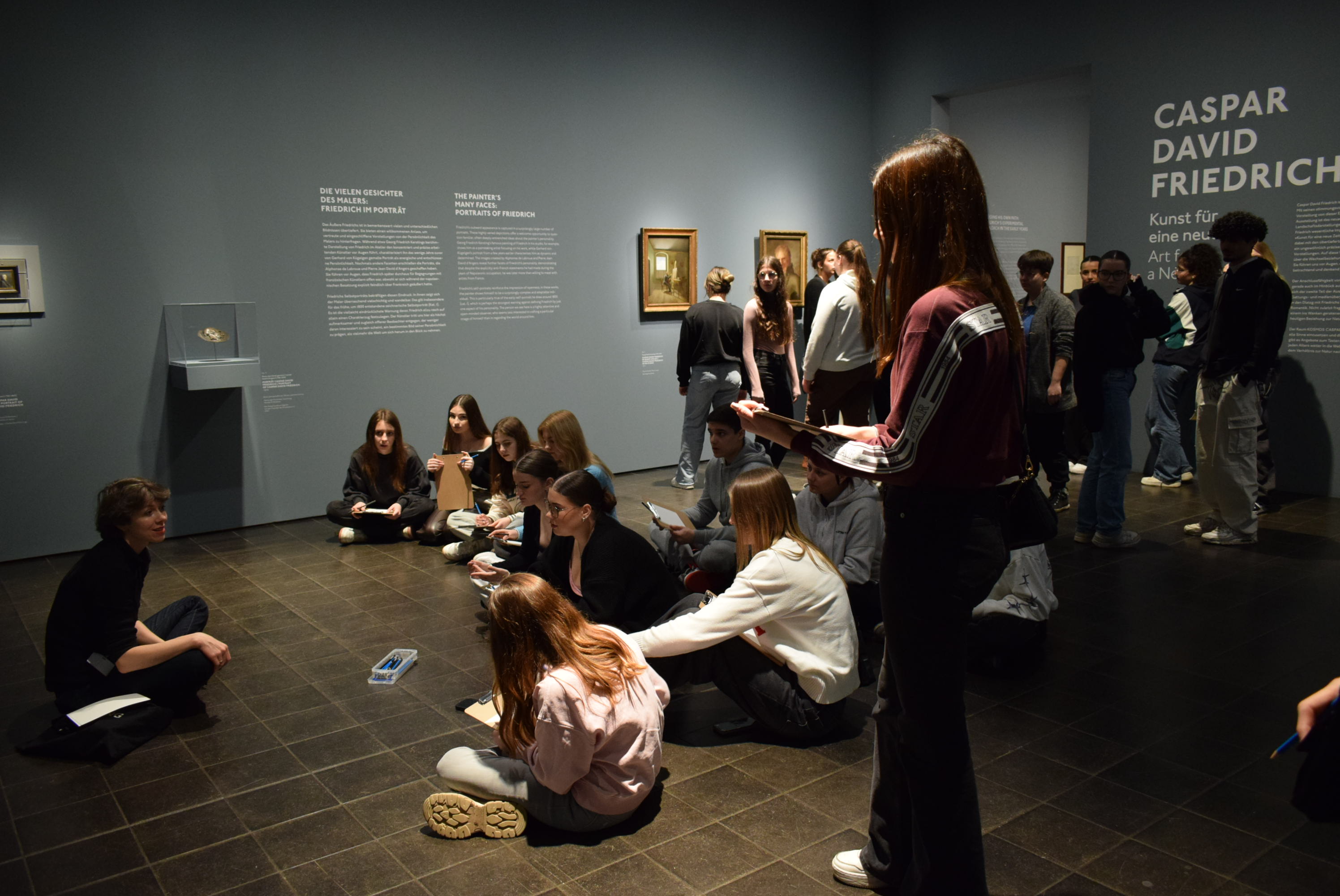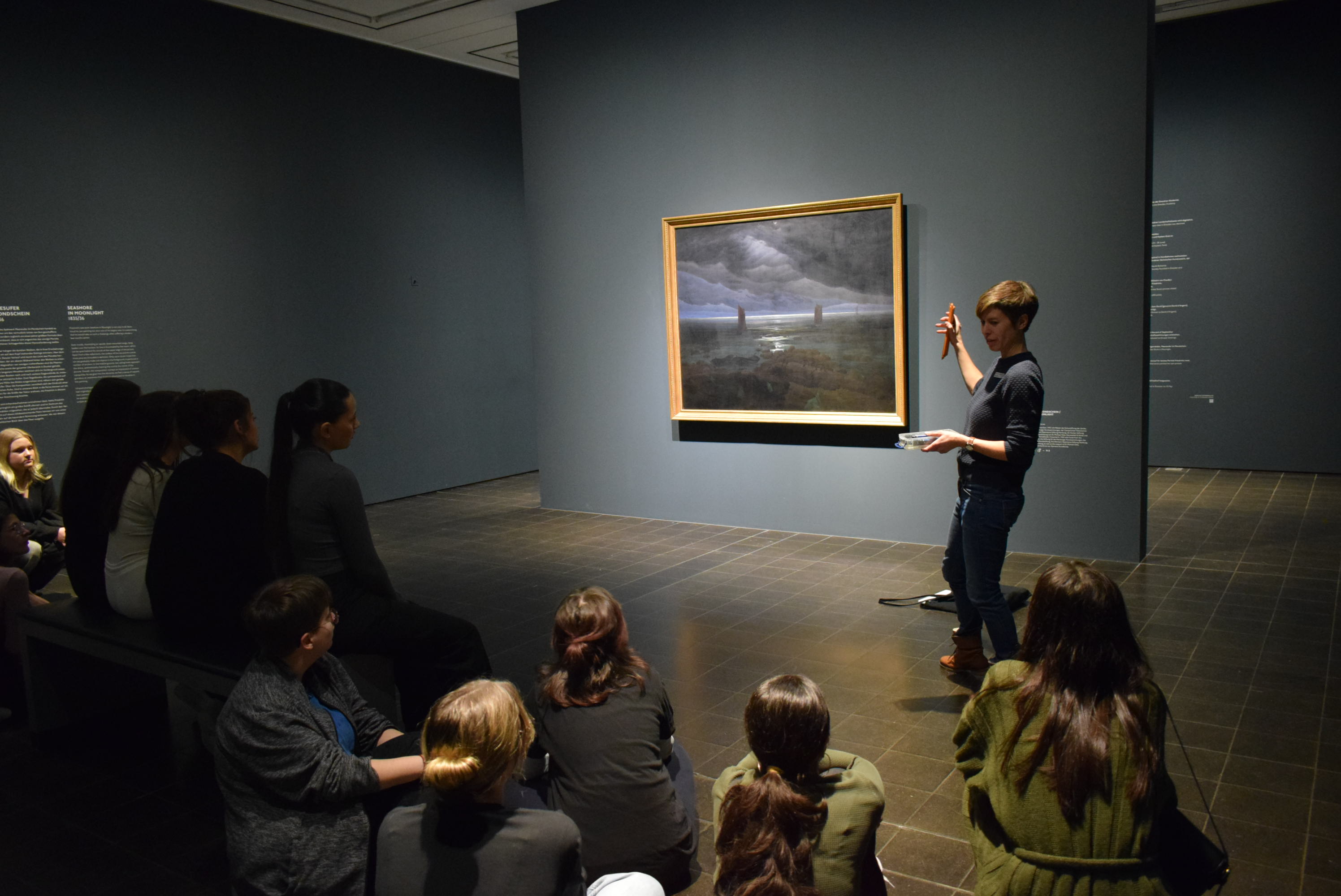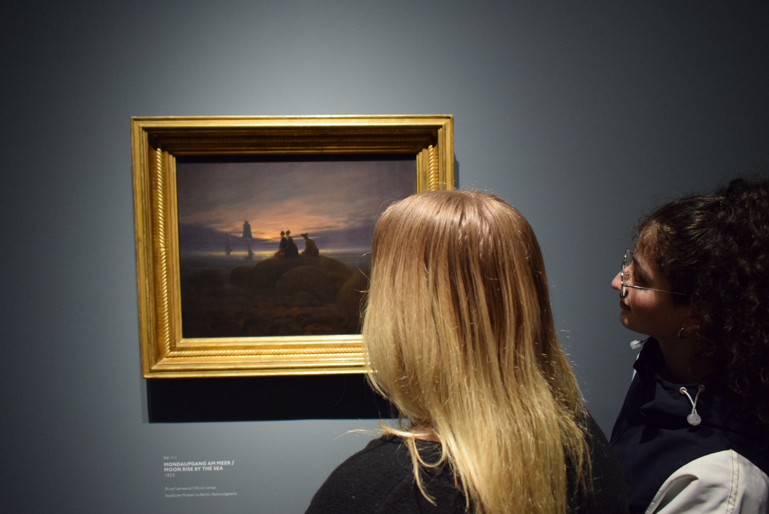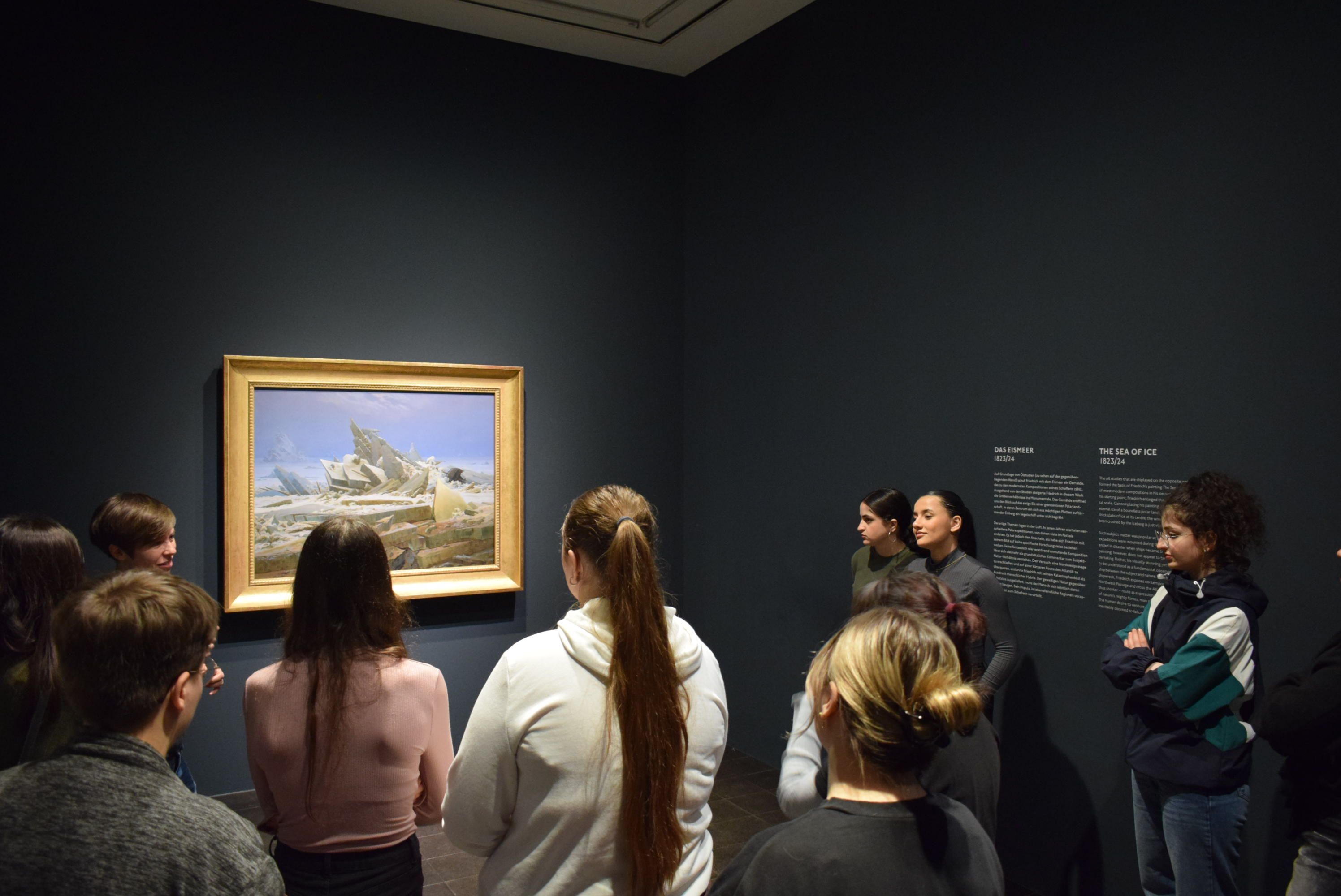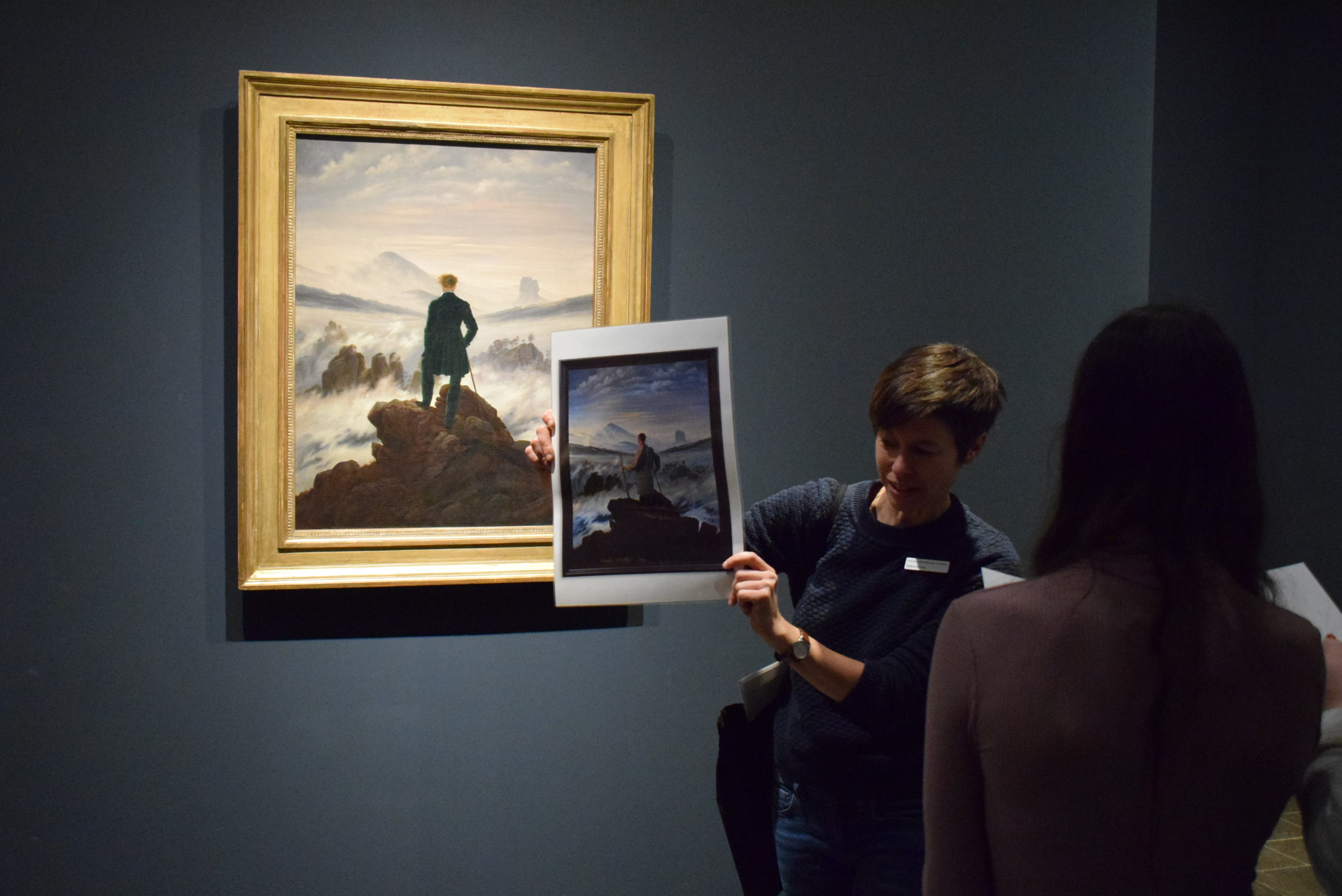 Unsere Werkbegleiterin bat darum, Stimmungen und Gefühle, die nun mit dem Mehr-Wissen entfacht wurden, auf Kärtchen zu schreiben, vorzutragen und kurz zu begründen. Auch wenn viele Werke von Caspar David Friedrich dem ersten Anschein nach eine düstere, bedrückende, schwermütige, ja auch bedrohliche Stimmung hervorrufen, so lassen sich oft Bildelemente darin finden, die das Gleichgewicht mit Hoffnung und Zuversicht, „dem Blick nach vorn“ herstellen – das galt für ihn persönlich vor allem, weil er in seinem Leben viele Schicksalsschläge ertragen musste.