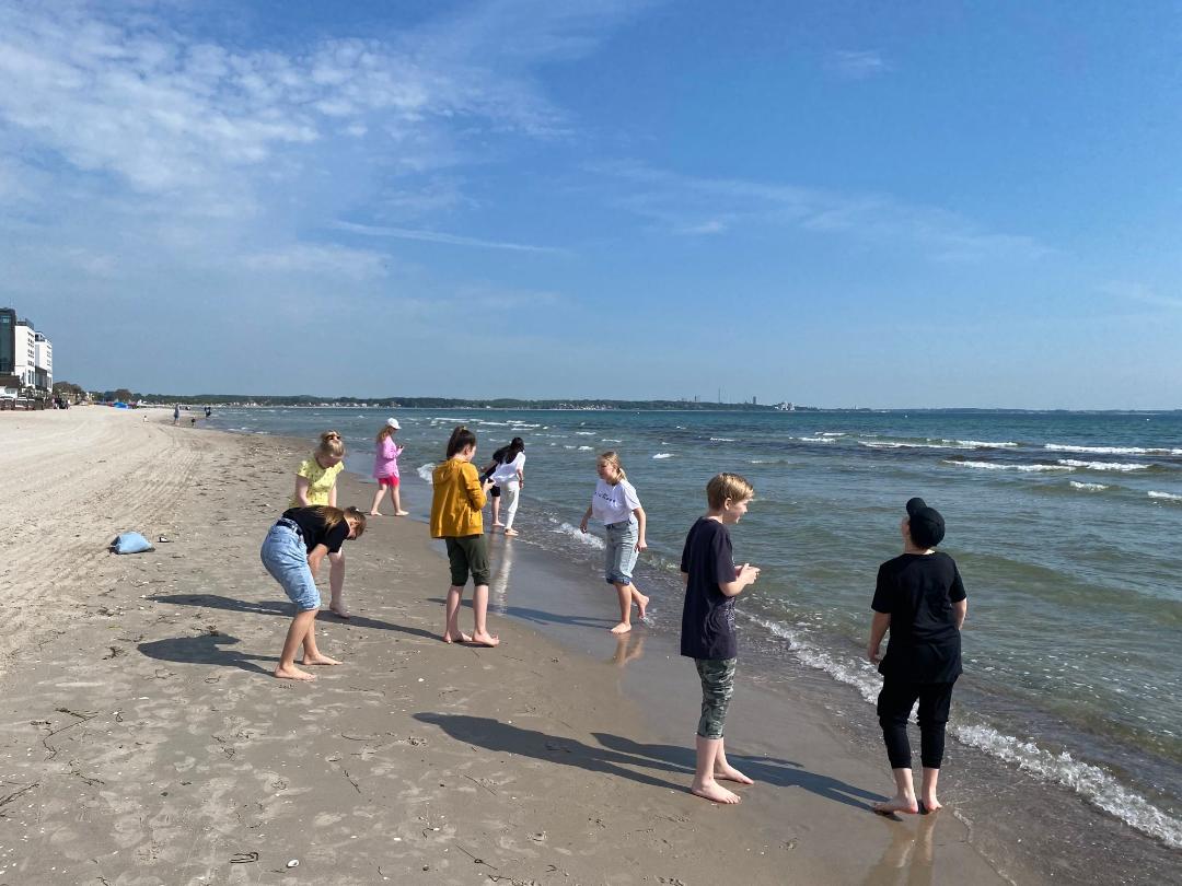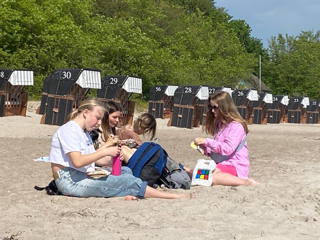 Angekommen in Scharbeutz erreichten wir den Strand nach einem kurzen Spaziergang. Dort angekommen stürzten sich bereits die ersten Schülerinnen und Schüler ins 13° kalte Wasser. Es folgte ein Spaziergang am Strand nach Timmendorfer Strand. Unterwegs fanden wir die unterschiedlichsten Muscheln, Seetang und vieles mehr. Während unserer Rast zwischen Timmendorf und Scharbeutz nutzten viele der ukrainischen Schülerinnen und Schüler die Gelegenheit, in der kalten Ostsee zu baden.