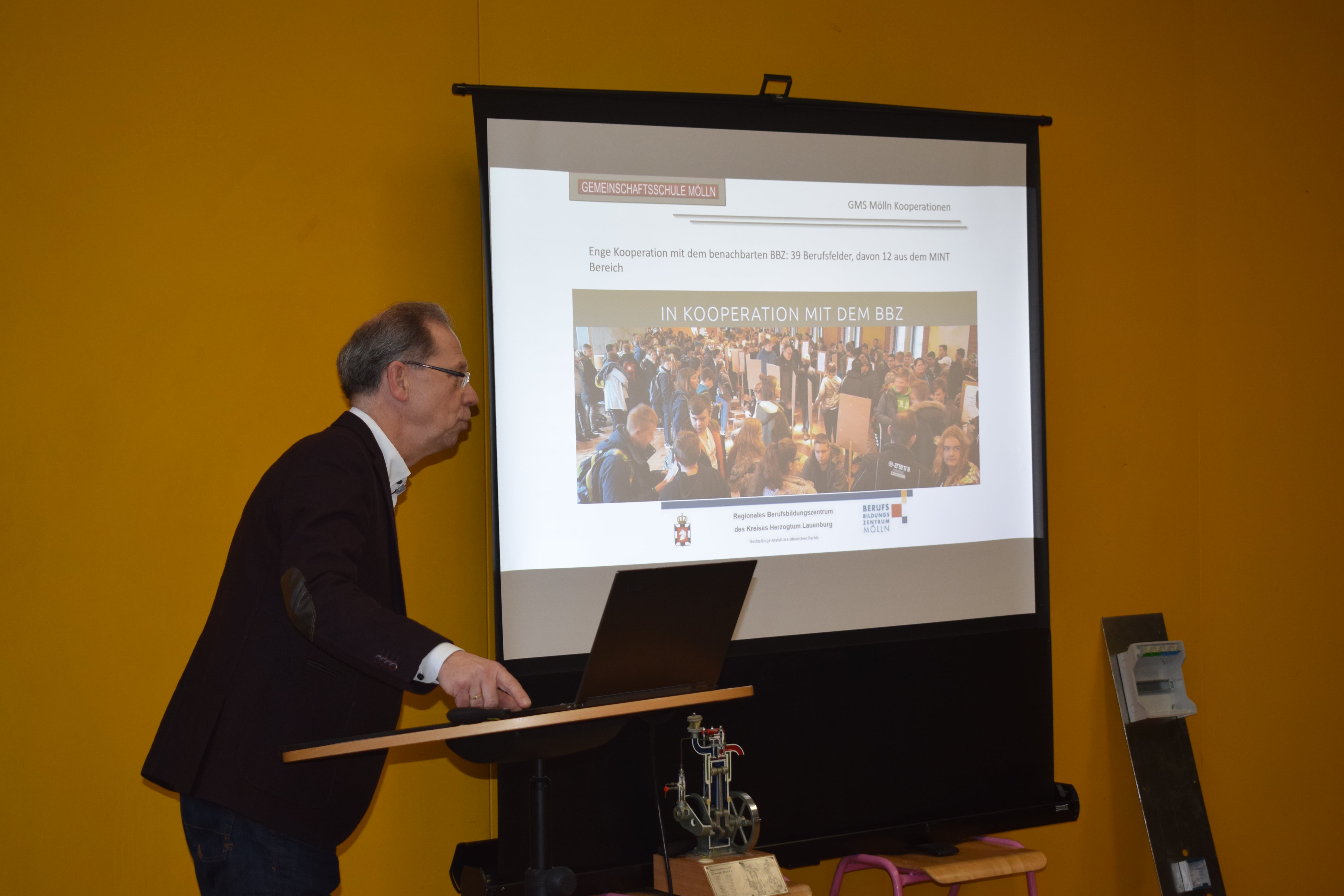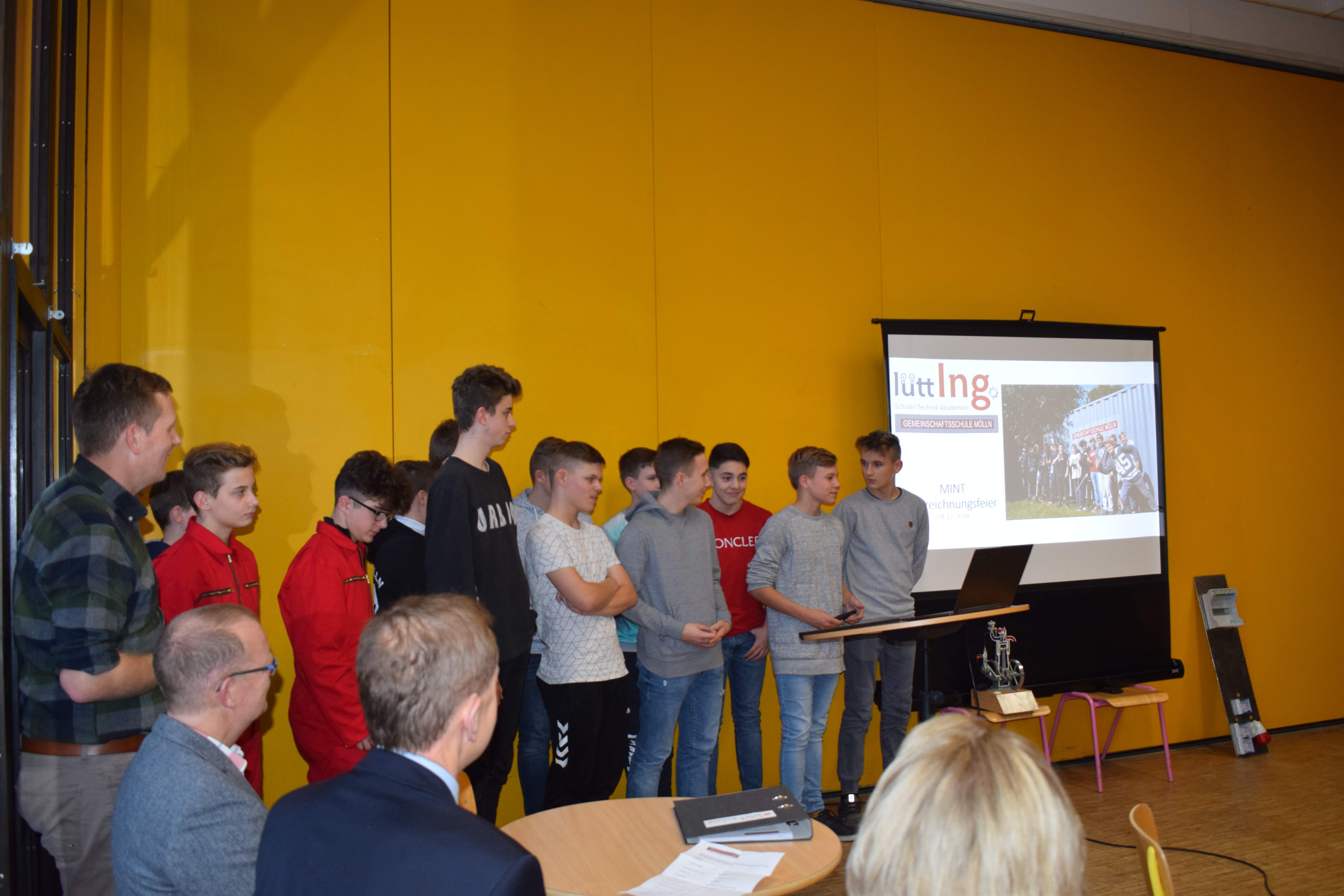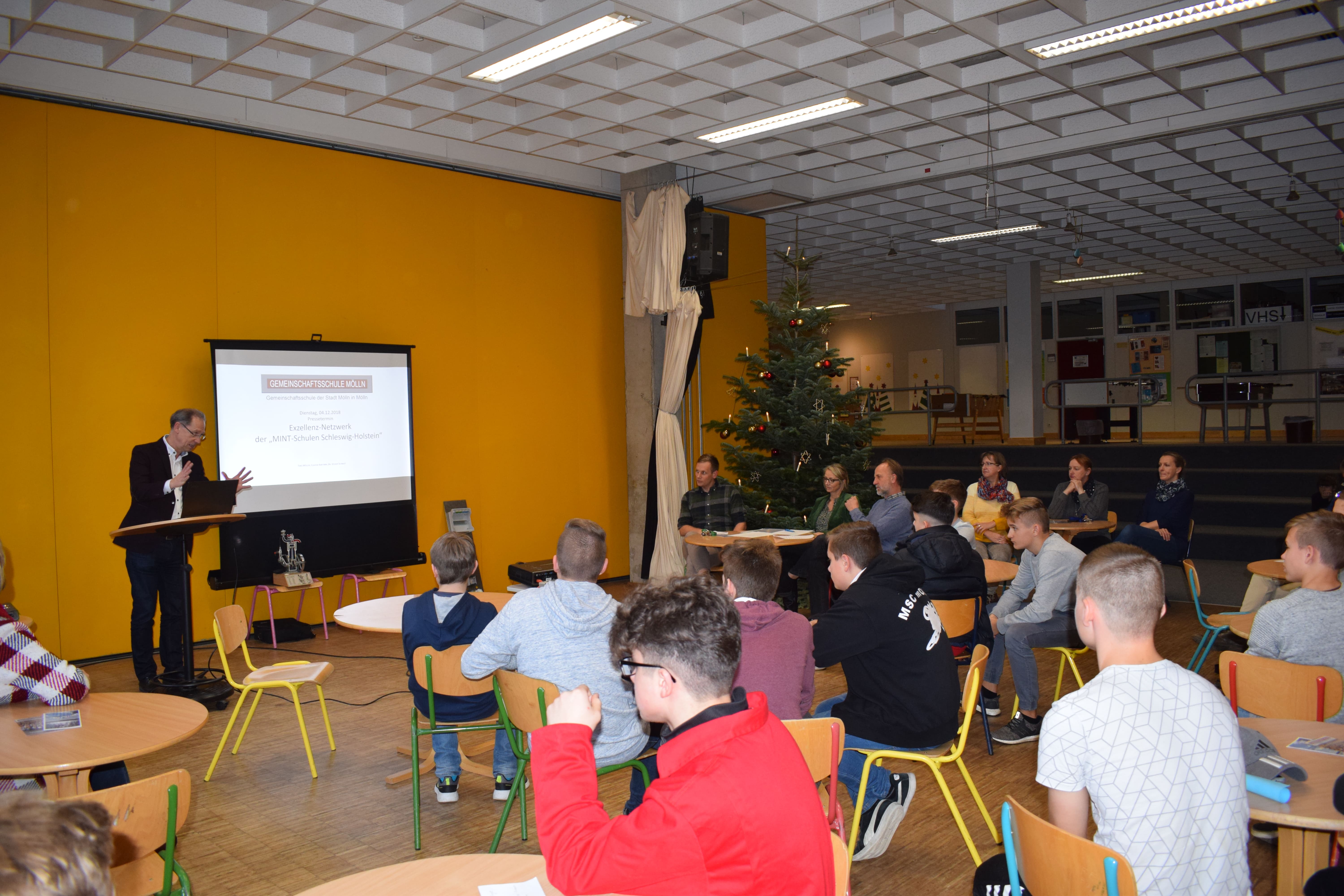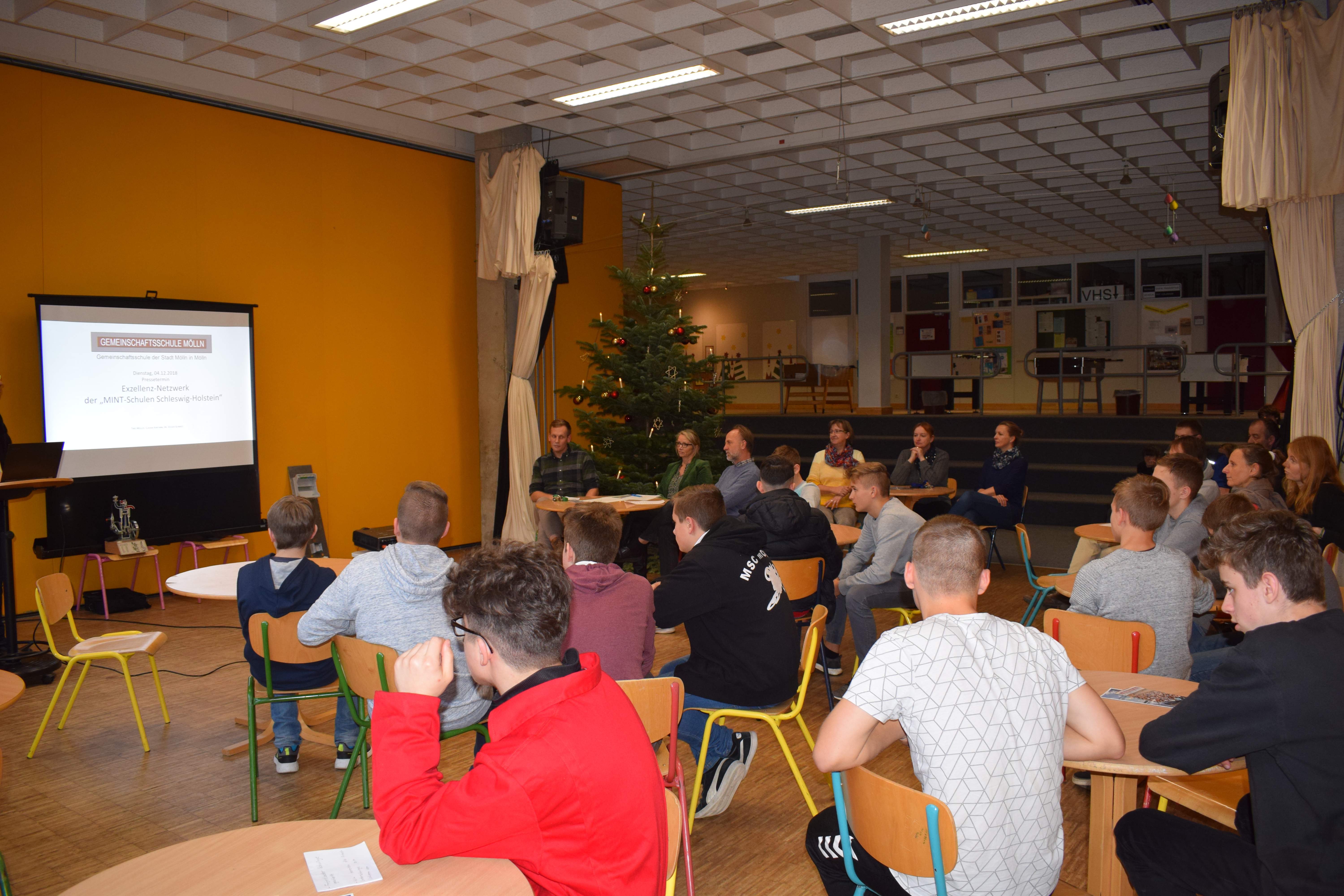 Die Vorsitzende des Auswahlgremiums, Frau Sabine Petersen (Technische Akademie Nord) aus Kiel, hob in Ihrem Grußwort die besonderen Leistungen der Gemeinschaftsschule Mölln im Bereich MINT hervor. Auch der Bürgermeister der Stadt Mölln Herr Jan Wiegels und der stellvertretende Schulleiter des Berufsbildungszentrums Mölln Herr Matthias Links sprachen ein Grußwort. Außerdem nahm an der Veranstaltung die Vorsitzende des Ausschusses für Schule, Sport, Jugend und Soziales, Frau Christiane Gehrmann, teil.