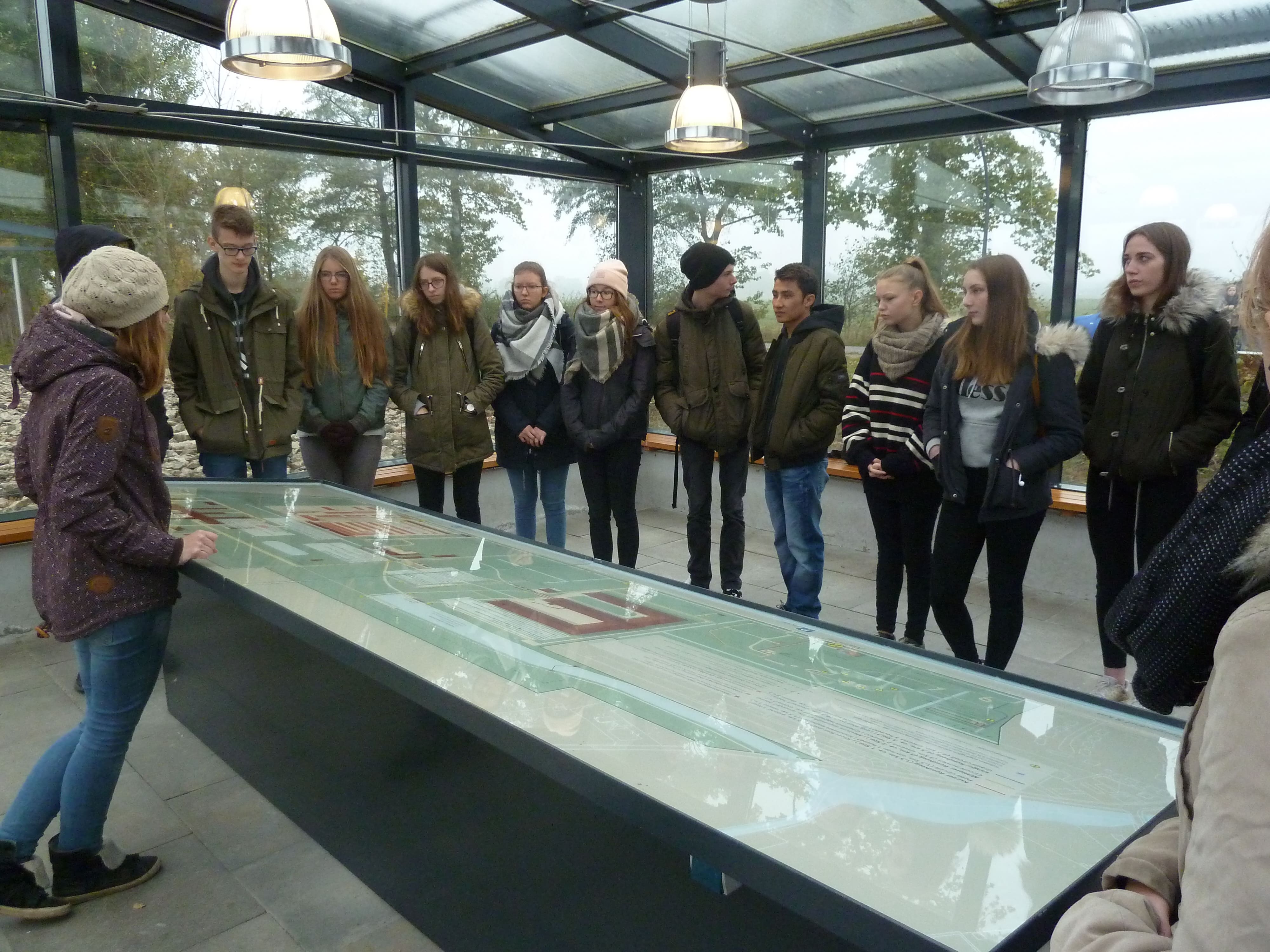 Anschließend sind wir zur alten Ziegelei gegangen, da Neuengamme kein Vernichtungs-, sondern ein Arbeitslager war. Die Ziegelei ist ein e-förmiges Gebäude, das nicht saniert ist, wodurch man das Originalgebäude (bis auf die Maschinen) noch gut erkennt. Wir haben noch was zu den Berufen der Inhaftierten erfahren. Der schwerste Beruf war der eines Tongräbers: Man hat dort 12 Stunden lang Ton aus der Erde geschaufelt und dann die bis zu einer Tonne schweren Loren geschoben. Es war wirklich sehr interessant. Am Ende sind wir zum Haus des Gedenkens gegangen, wo man im Inneren nochmal ein Modell der Gedenkstätte hat sowie eine Galerie in chronologischer Reihenfolge mit den Namen der verstorbenen Gefangenen. Es war sehr schockierend, als uns unser Guide erzählte, dass dies nur die bekannten Namen sein und dies schon 27.000 Namen waren. Nachdem jeder sich die Galerie angesehen hatte, bedankten wir uns und fuhren schließlich mit den Bussen zurück. Es war für uns alle ein sehr spannender Tag. (Lea D. und Finja G.)