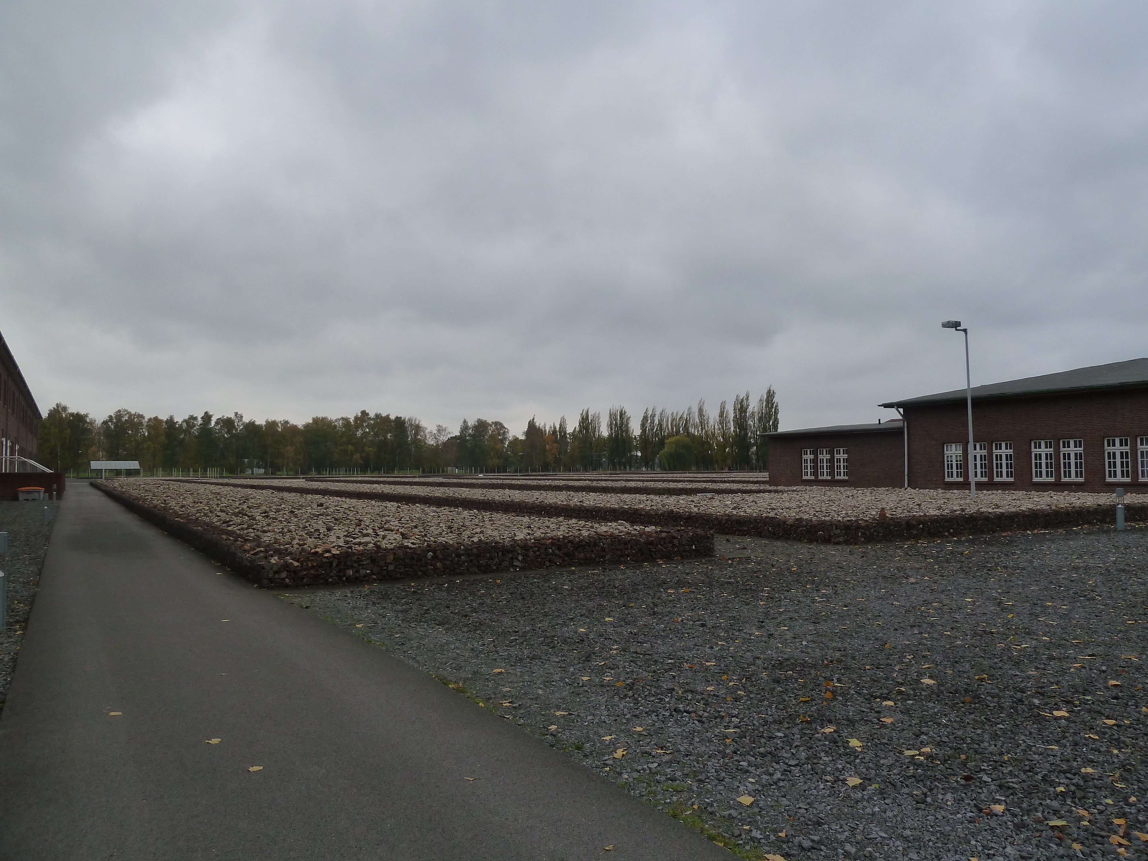 Nach wenigen Minuten kam dann unser Guide, der sich uns vorgestellt hat. Danach sind wir losgegangen und an den symbolischen Baracken vorbei zu dem „Platz des Krematoriums des ehemaligen KZ-Neuengamme“. Als wir dort standen, war am Boden eine gravierte Betonplatte, auf der Steine und Geld niedergelegt worden sind. Unser Guide hat uns dann erklärt, dass das Bräuche aus den einzelnen Religionen sind. Nach einiger Zeit sind wir dann zurückgegangen, wobei wir auf dem Weg an den Mauerresten des ,,Arrestbunkers´´ vorbei gekommen sind. Dort sah man fünf Mauerreste, die die Grundmauern der Zellen darstellen. Dieser Bereich ist außerdem noch extra „eingezäunt“. Es gibt keine wahren Zäune mehr, stattdessen wurden jetzt Metallpfeiler in die Erde getan, die die Zäune symbolisch darstellen.
