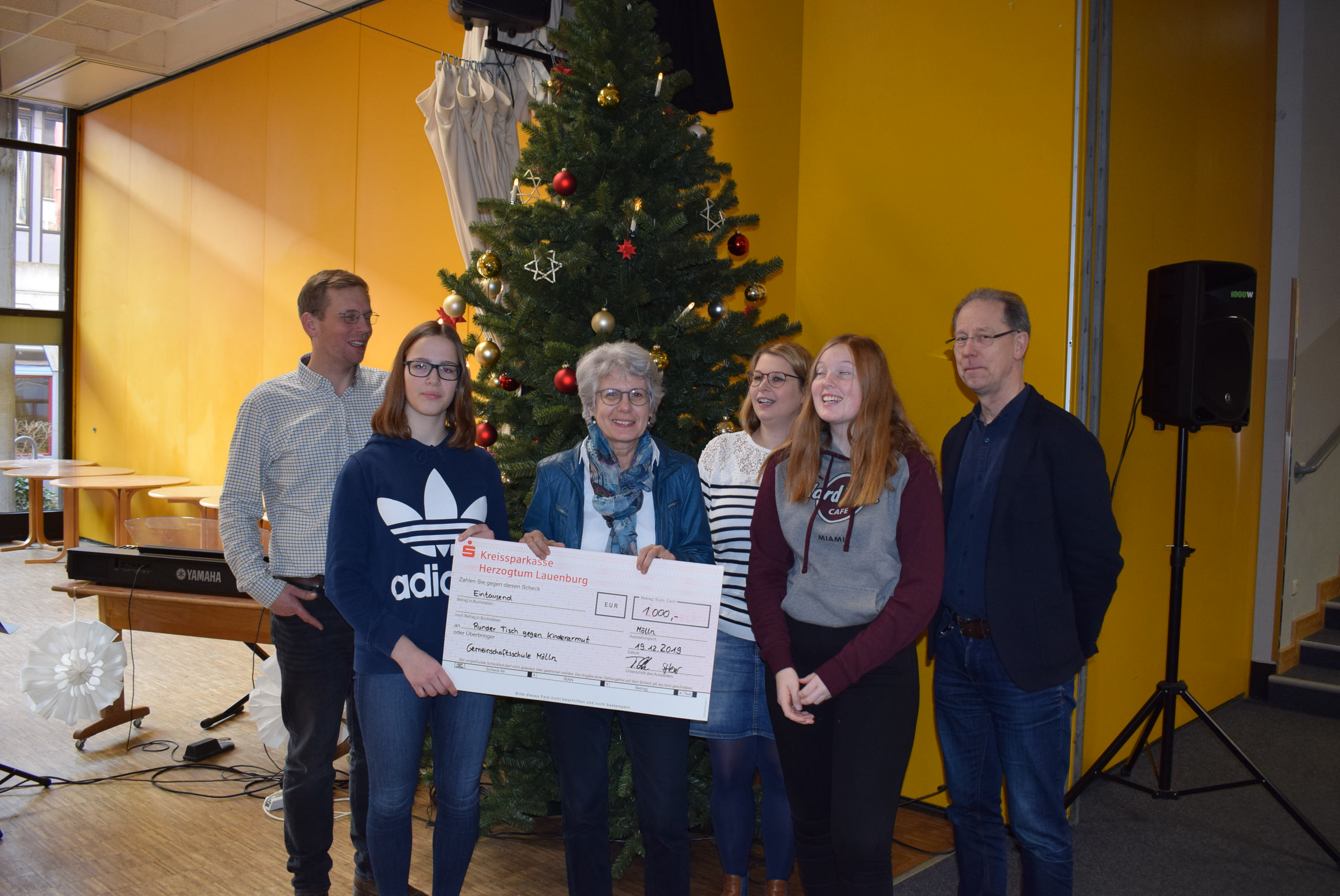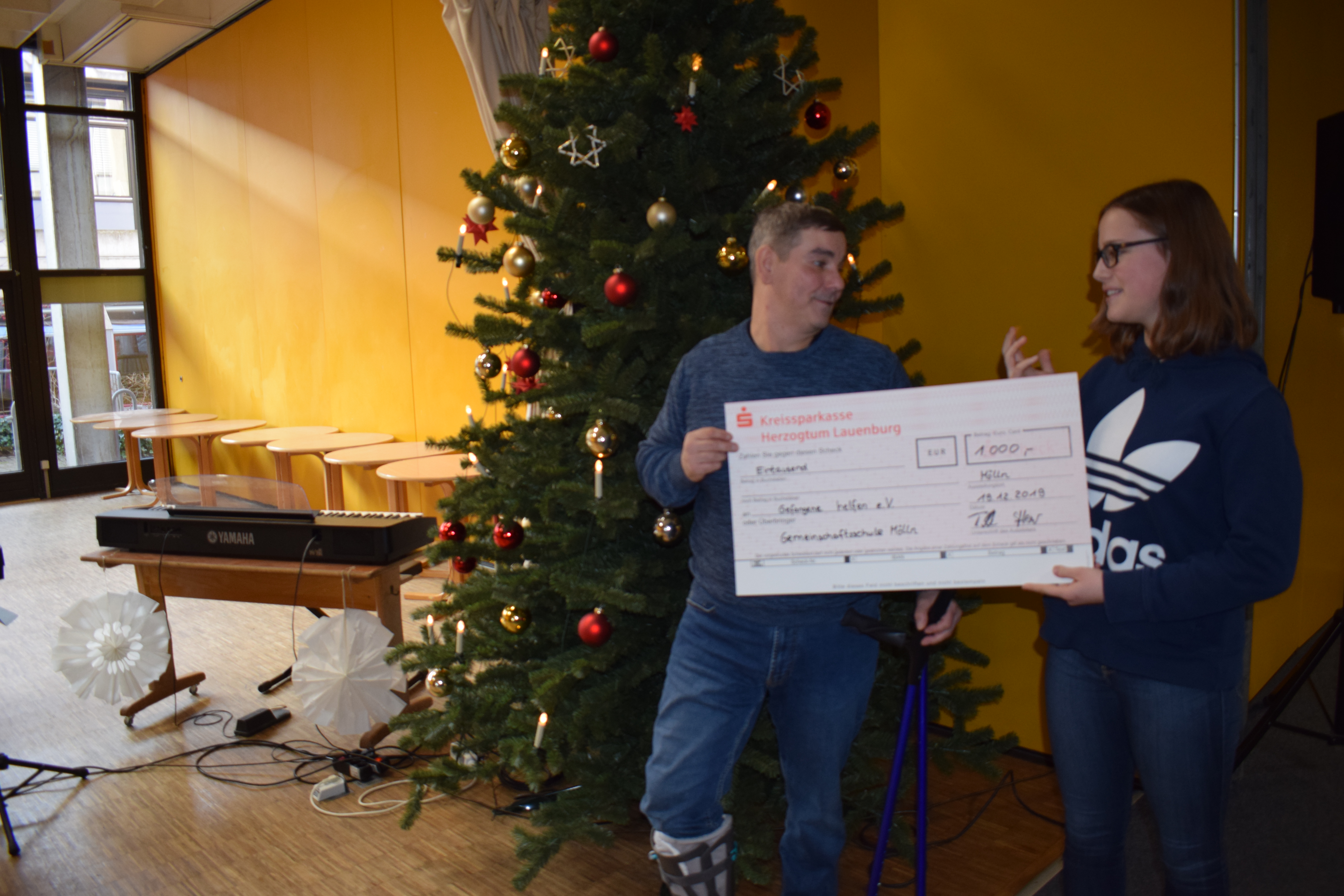 Pünktlich zur Weihnachtszeit und unter dem Tannenbaum konnte die Schülervertretung nun am 19.12.2019 unsere Spenden an Frau Jenner vom „Runden Tisch gegen Kinderarmut“ und Herrn Jakobs von „Gefangene helfen“ überreichen.