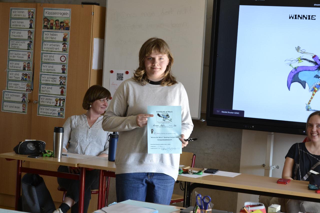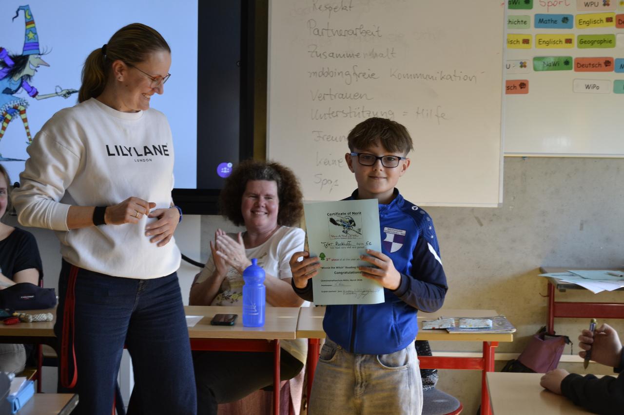 Der dritte Preis ging an Tyler Lennox Rockhoff (6e).Die Gewinner erhielten nicht nur großen Applaus, sondern auch Urkunden und – ganz nach dem Motto “READING IS FUN!“ – einen Gutschein der Möllner Buchhandlung „Weber“.