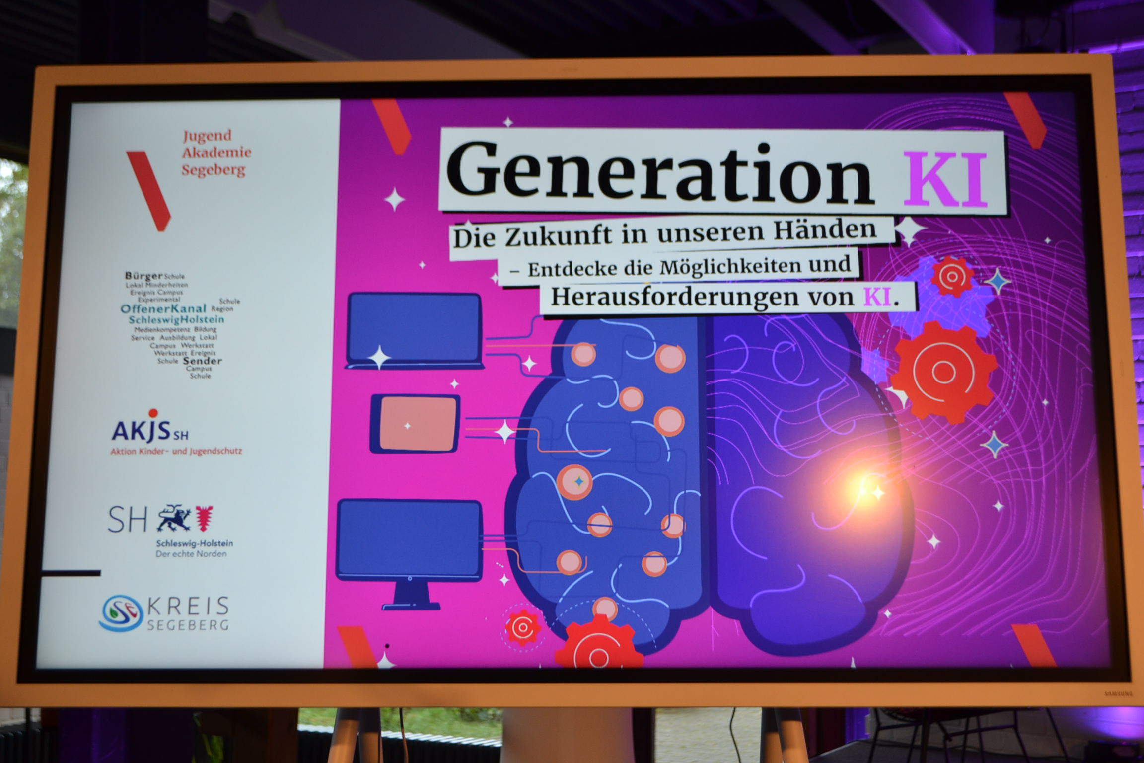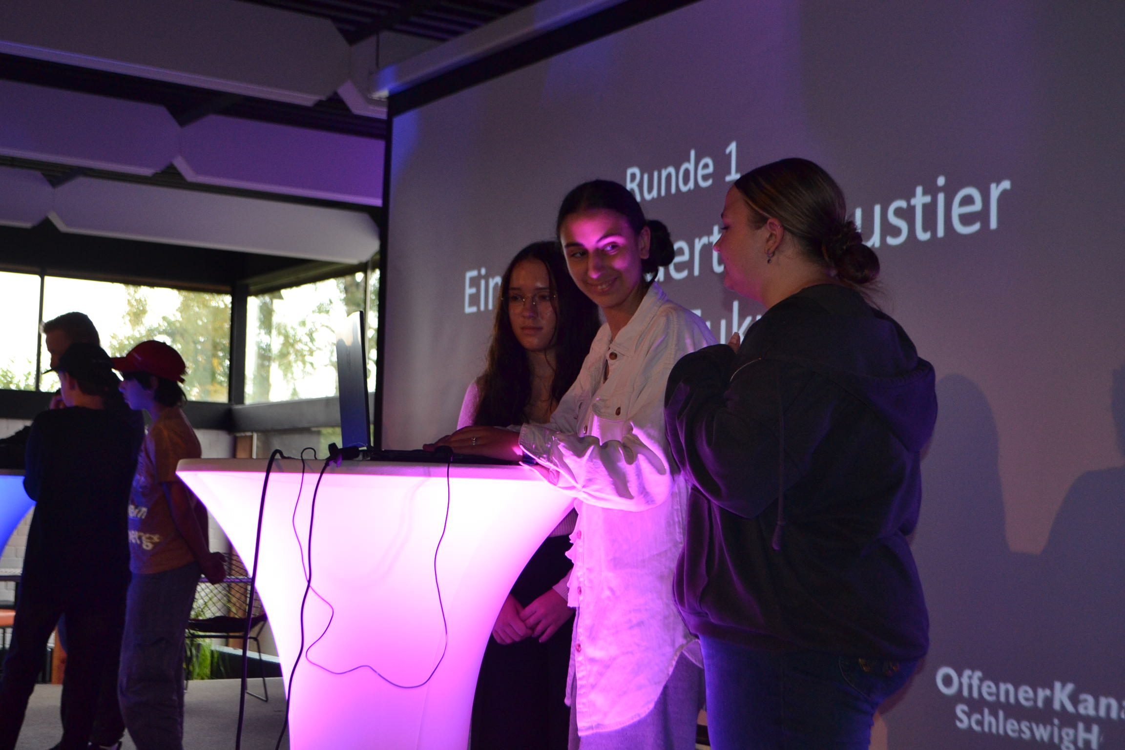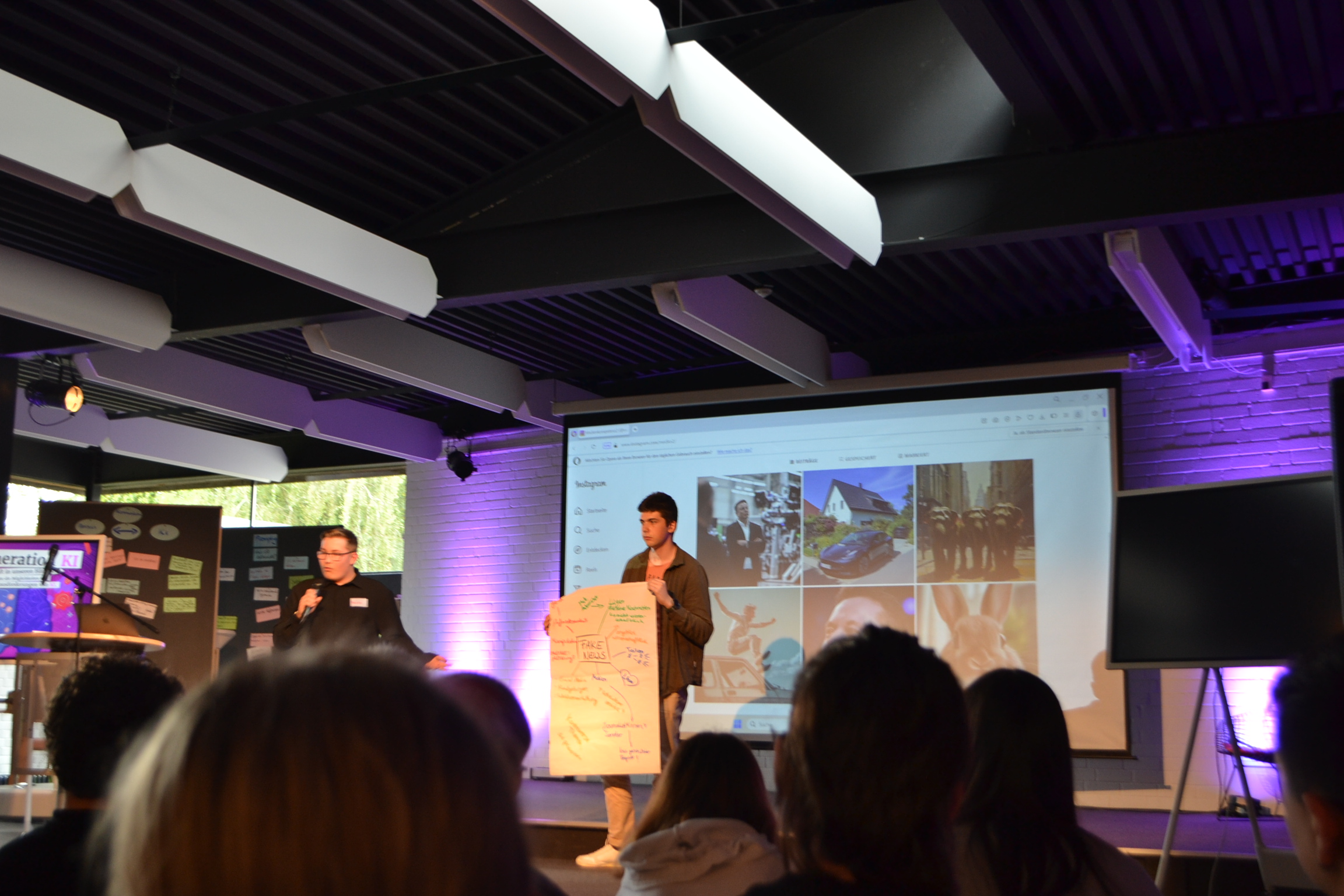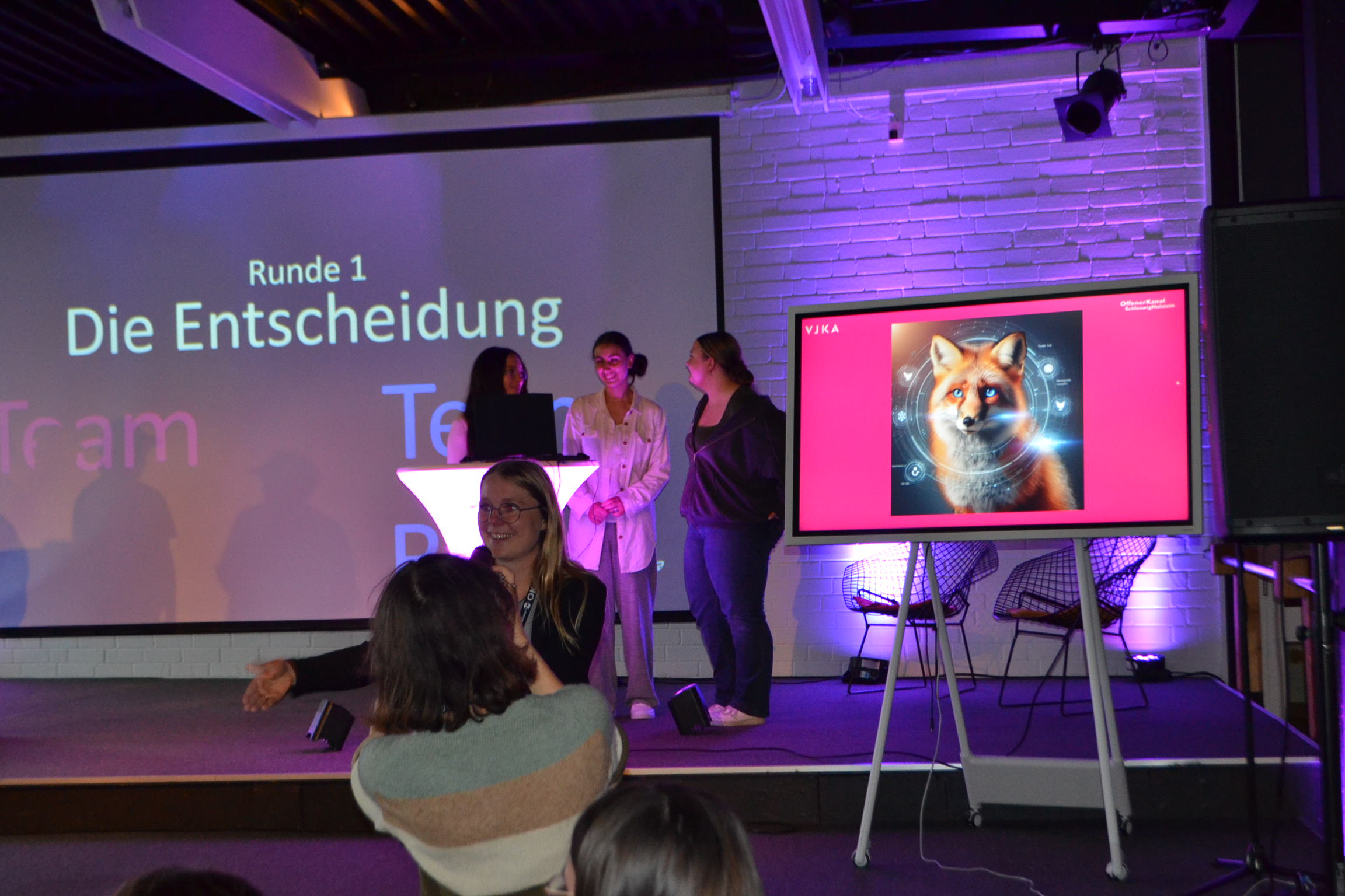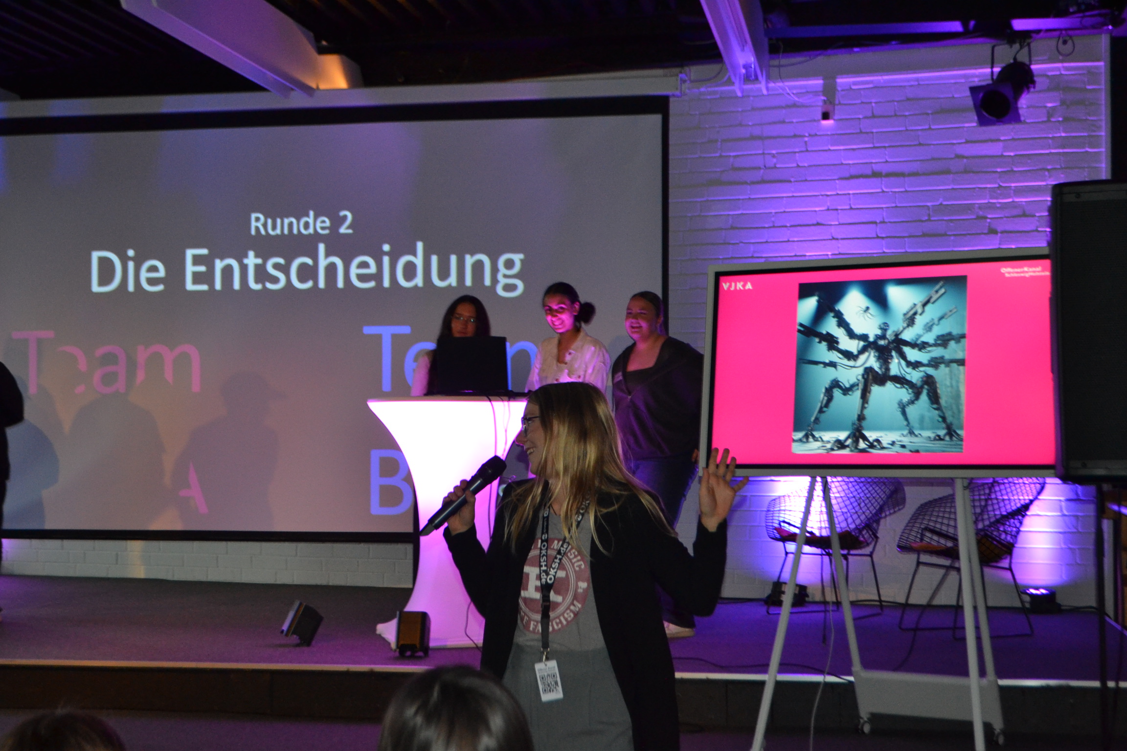 Alles begann mit einer längeren PowerPoint-Präsentation, die von einer KI generiert wurde. Sie erklärte uns die Herkunft, die Funktionsweise und die Auswirkungen von KI auf unser Leben. Anschließend haben wir ein Minispiel gespielt: Team Rot gegen Blau. In diesem Spiel mussten wir zu dritt auf die Bühne, wo ein Laptop bereitstand. Jeder es gab einen Bildschirm, auf dem das Publikum sehen konnte, was wir schrieben und auswählten. Ziel war es, ein Bild mithilfe von KI in 90, 60 oder 30 Sekunden zu generieren. Das Publikum durfte anschließend entscheiden, welches der Bilder gewonnen hat.