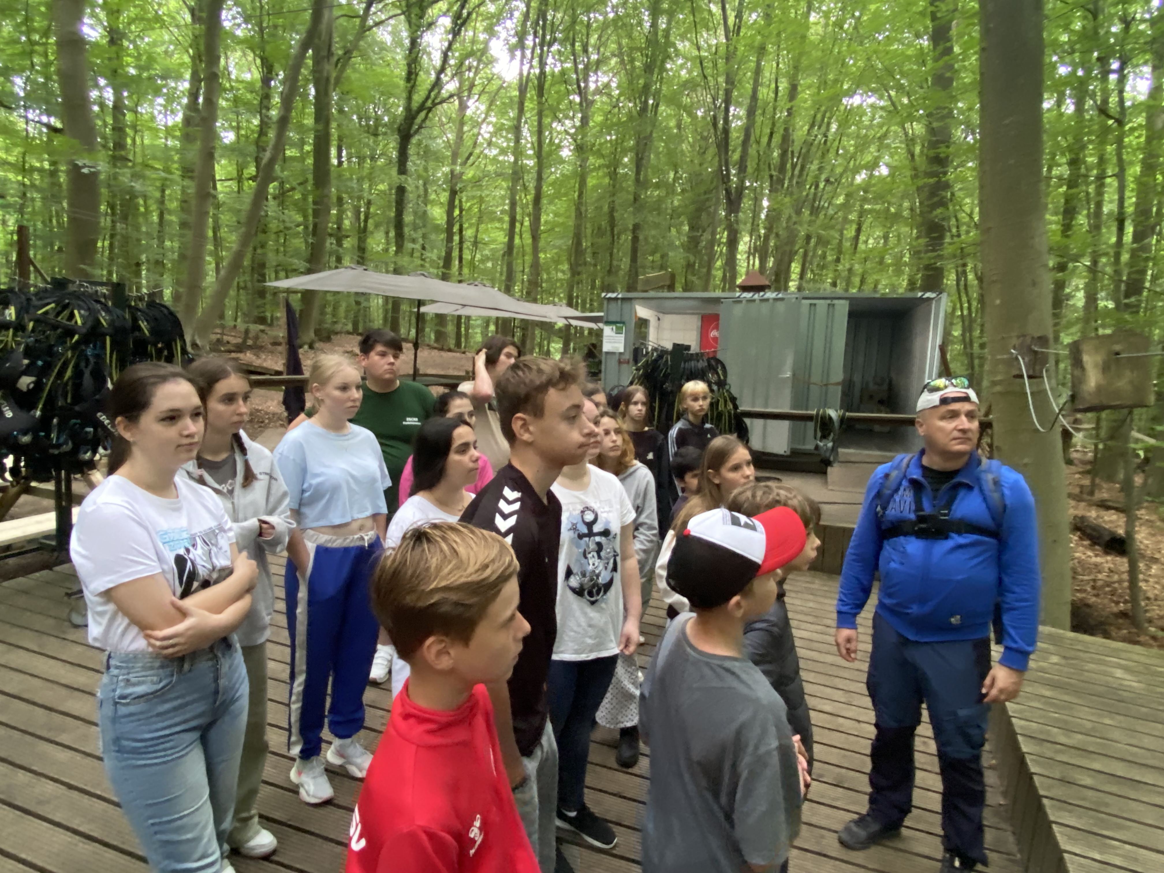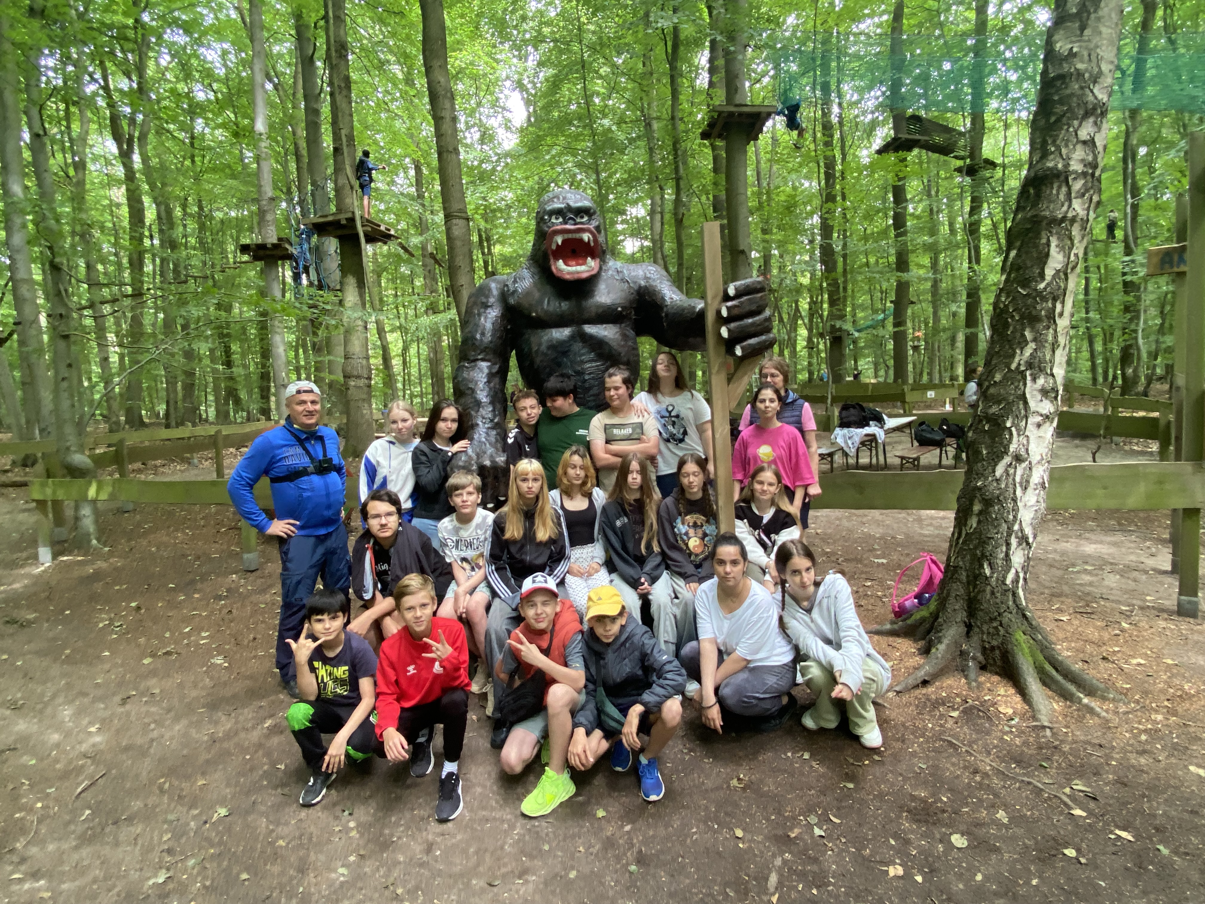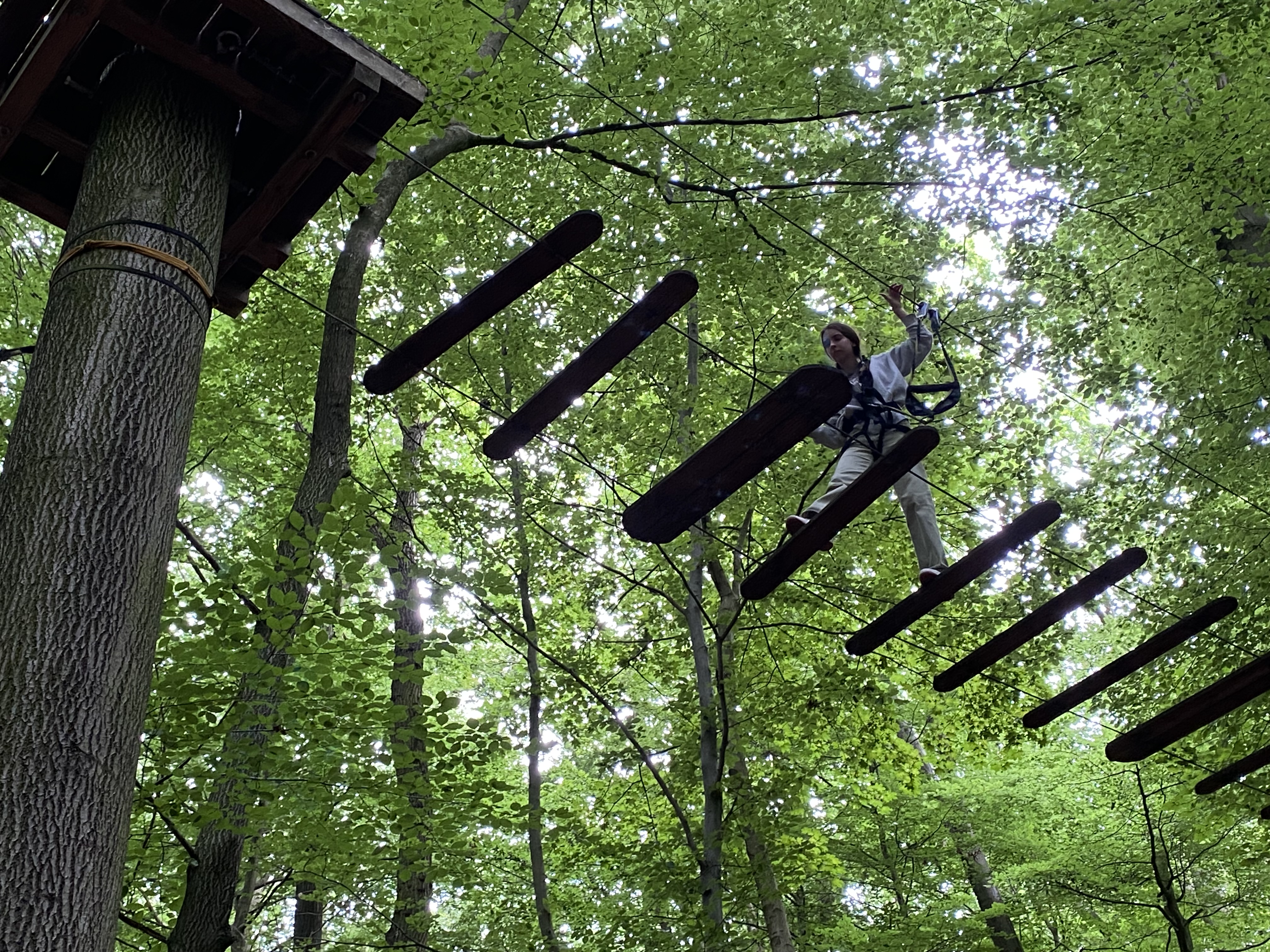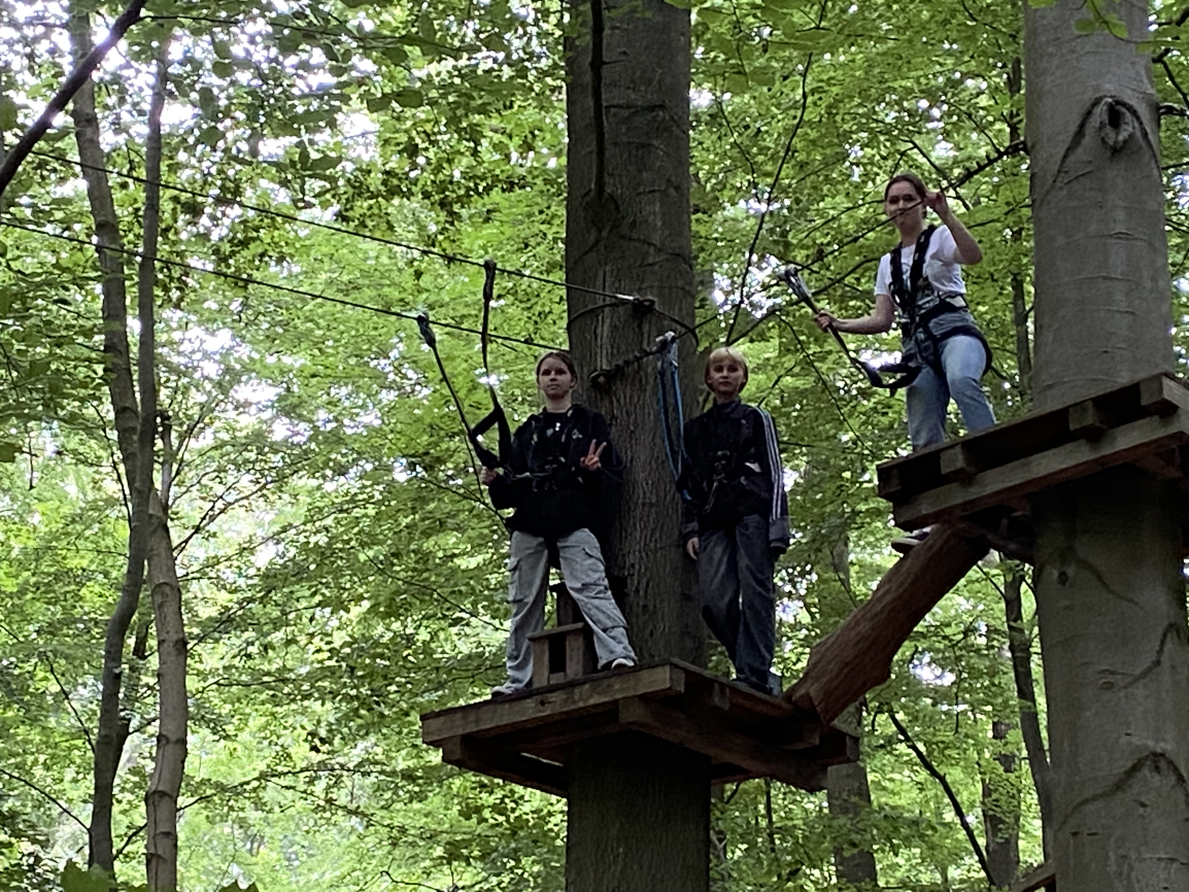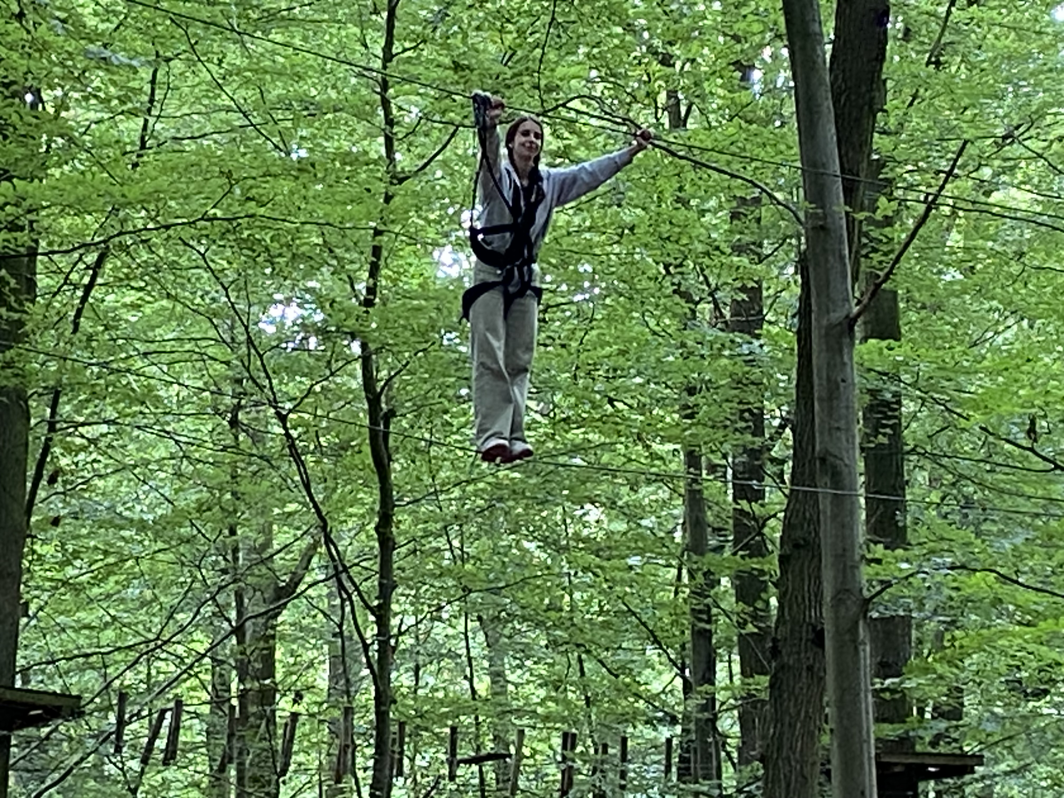 Wir haben dann am Freitag noch die Fische im Sealife-Center bewundert und waren abends ziemlich müde vom vielen Laufen. Am Samstag waren wir im Waldhochseilgarten und das war wirklich ein einmaliges Erlebnis: In schwindelnder Höhe mussten wir auf einem Seil balancieren, über schwankende Schaukeln klettern und mit oberhalb des Kopfes eingehakten Sicherungsseilen durch die Luft „fliegen“.