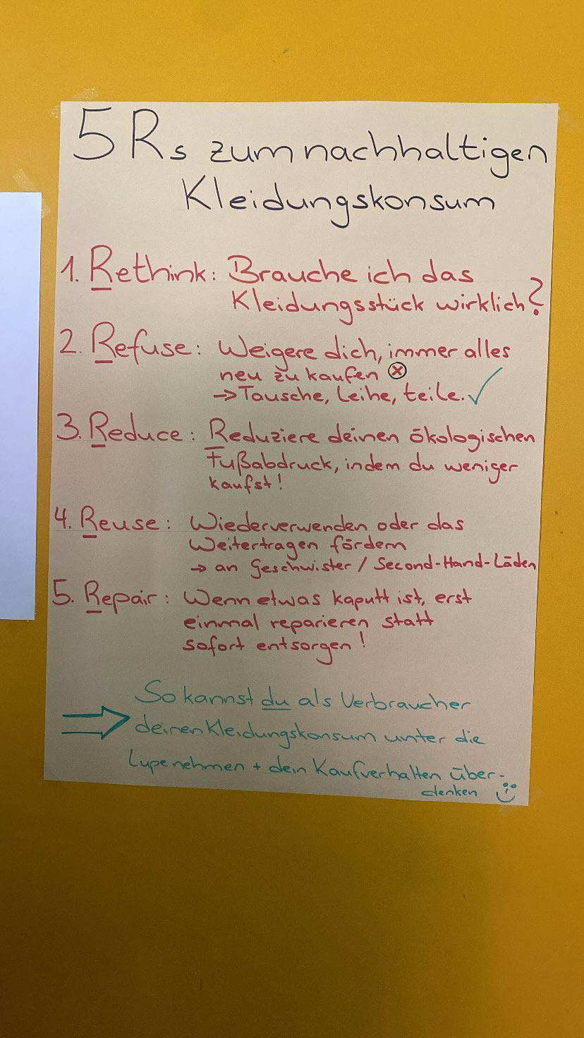 Mit unserem Projekt wollten wir ein Zeichen setzen: Secondhand-Kleidung zu tragen bedeutet, Ressourcen zu schonen, Verpackungsmüll zu vermeiden und die Menge an Textilabfällen zu reduzieren. Jeder kleine Beitrag hilft.
