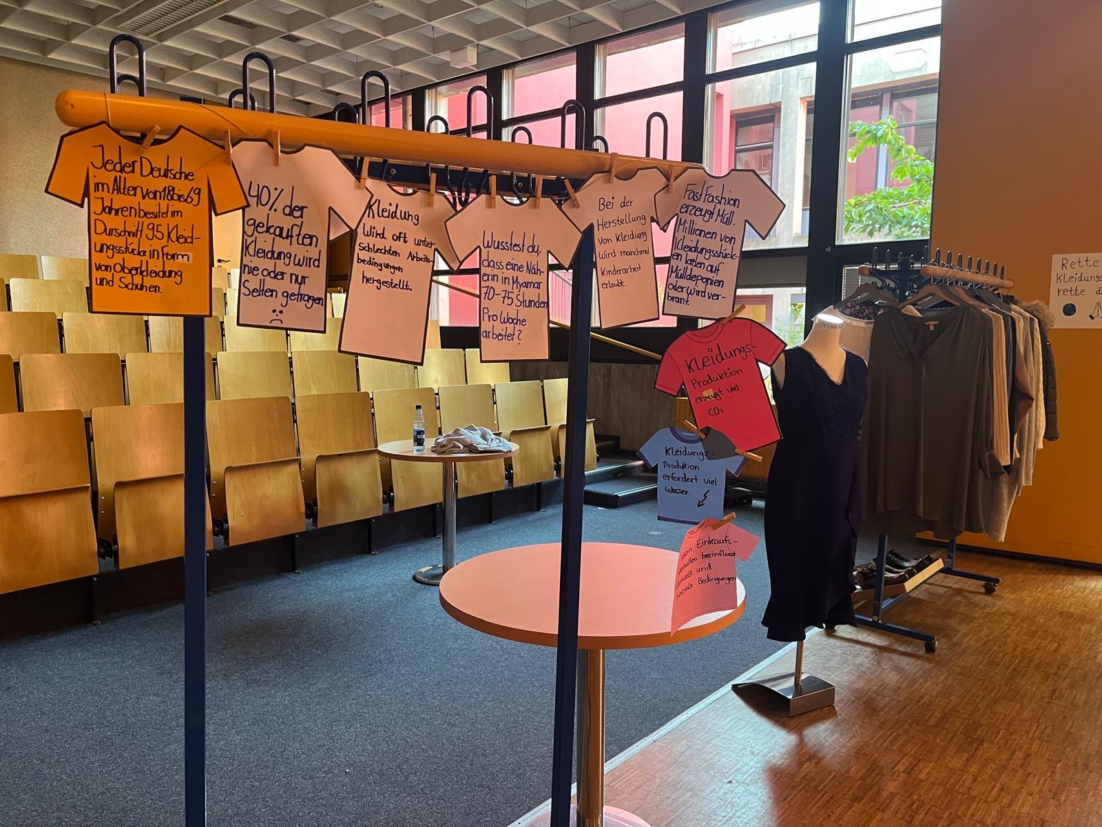Der Höhepunkt des Projekts war die dreistündige Kleiderbörse am 13. Juni. In 30-Minuten-Slots nahmen verschiedene Klassenstufen teil. In Kleingruppen durchliefen sie vier Stationen: den Kleiderstand mit Umkleide, den Infostand, das Quiz und ein Video-Bereich. Das Forum wurde dafür wie ein kreatives Atelier umgestaltet. Jede*r durfte sich Lieblingsstücke aussuchen und mitnehmen – auf Spendenbasis.