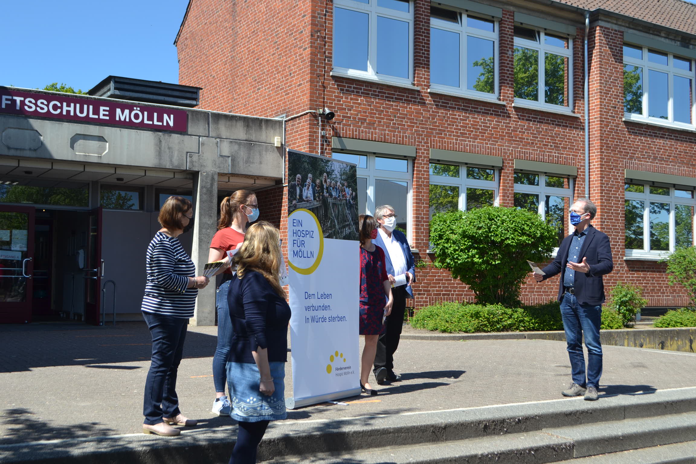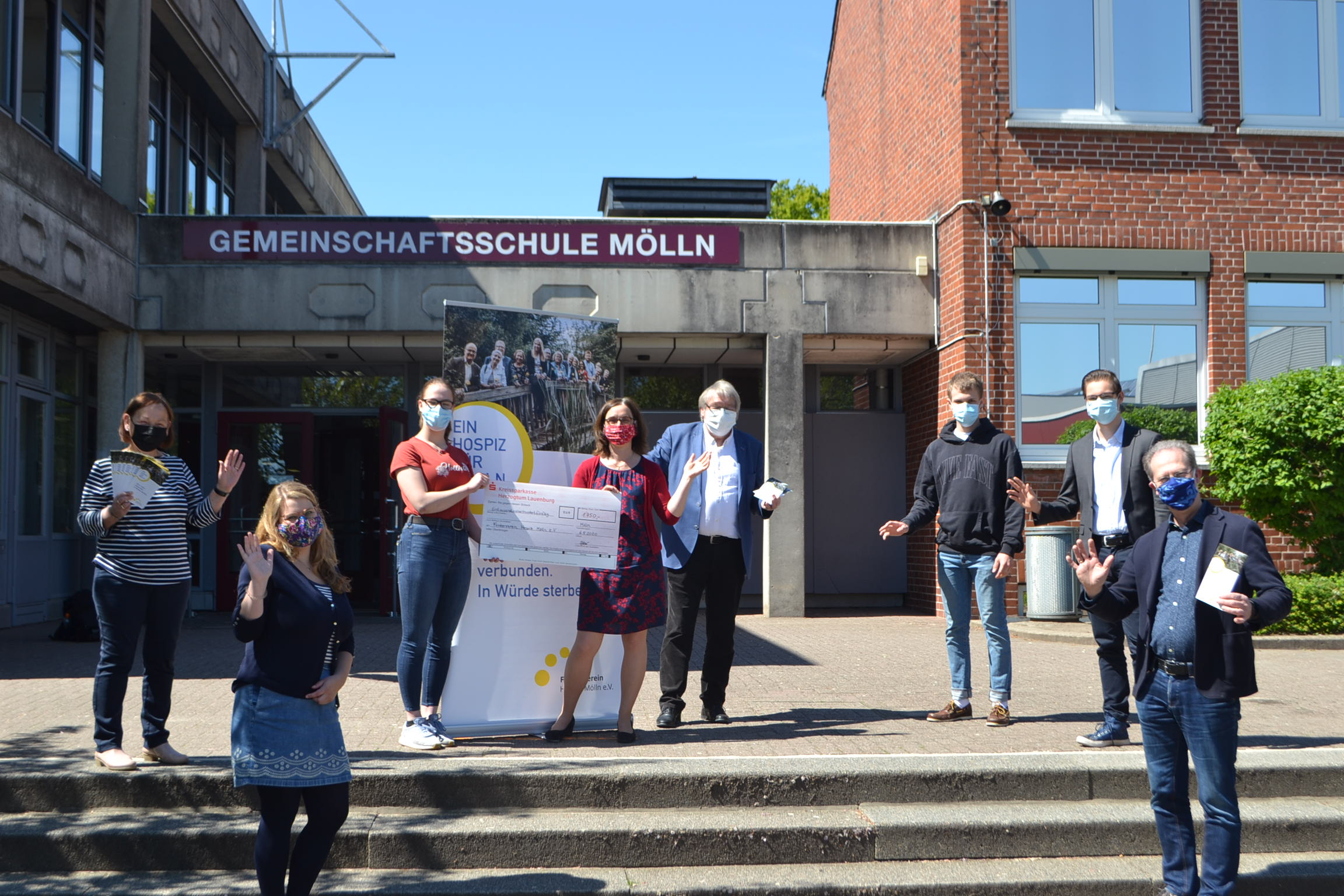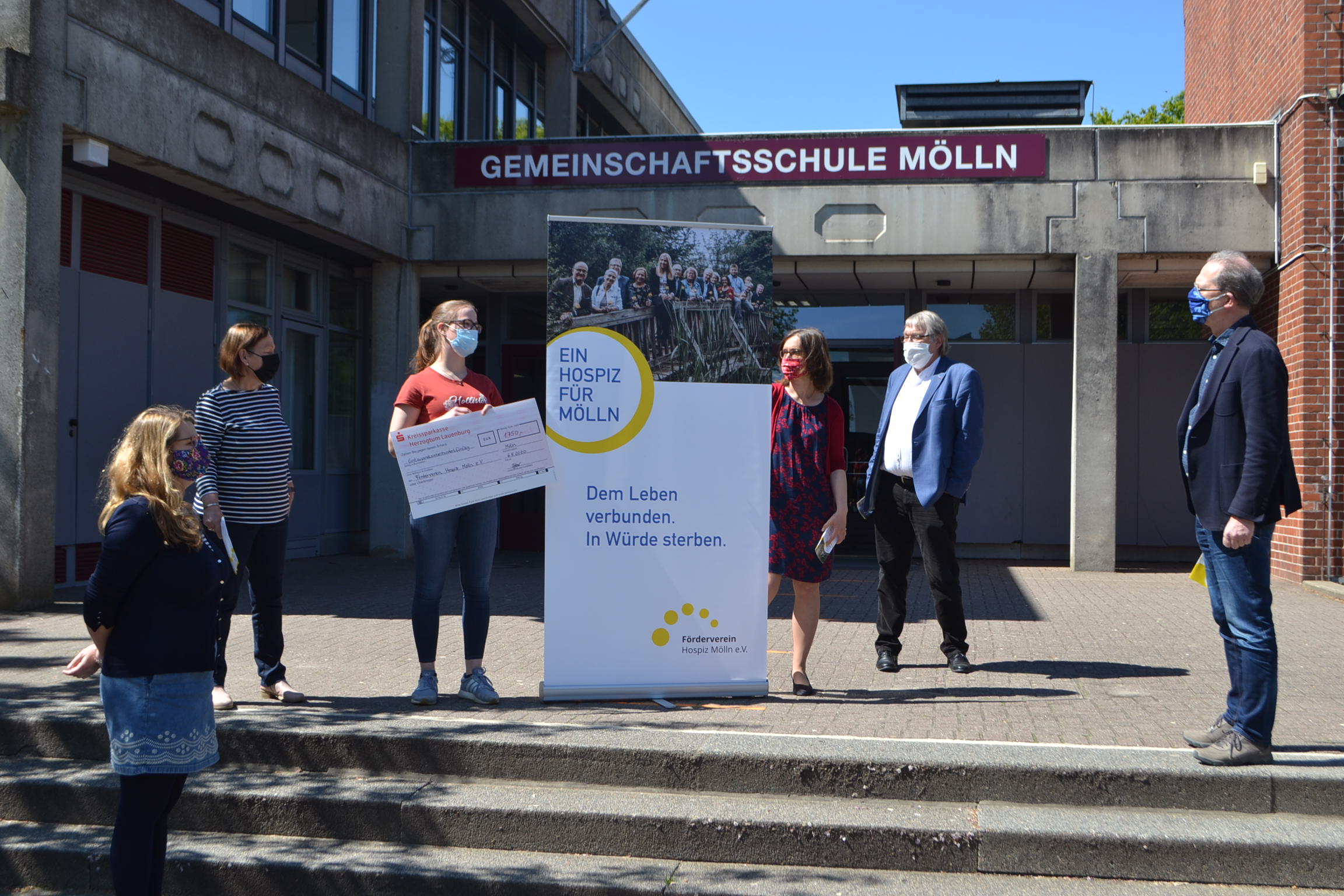 Auch wenn die Spendenübergabe vor der Schule und mit Masken ein etwas ungewohntes Bild bot, freuten sich alle Beteiligten sehr darüber, dass das Geld offiziell übergeben werden konnte.