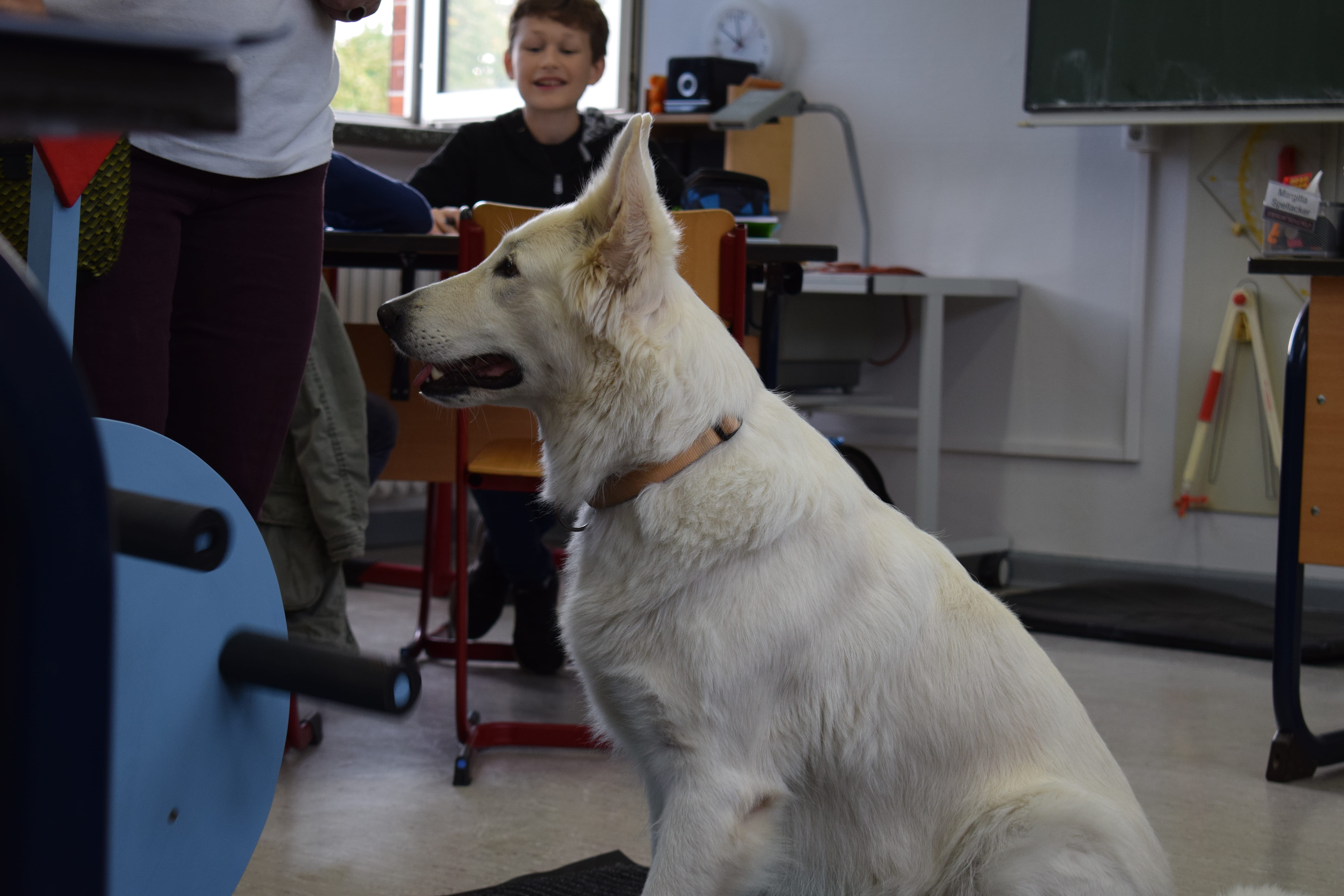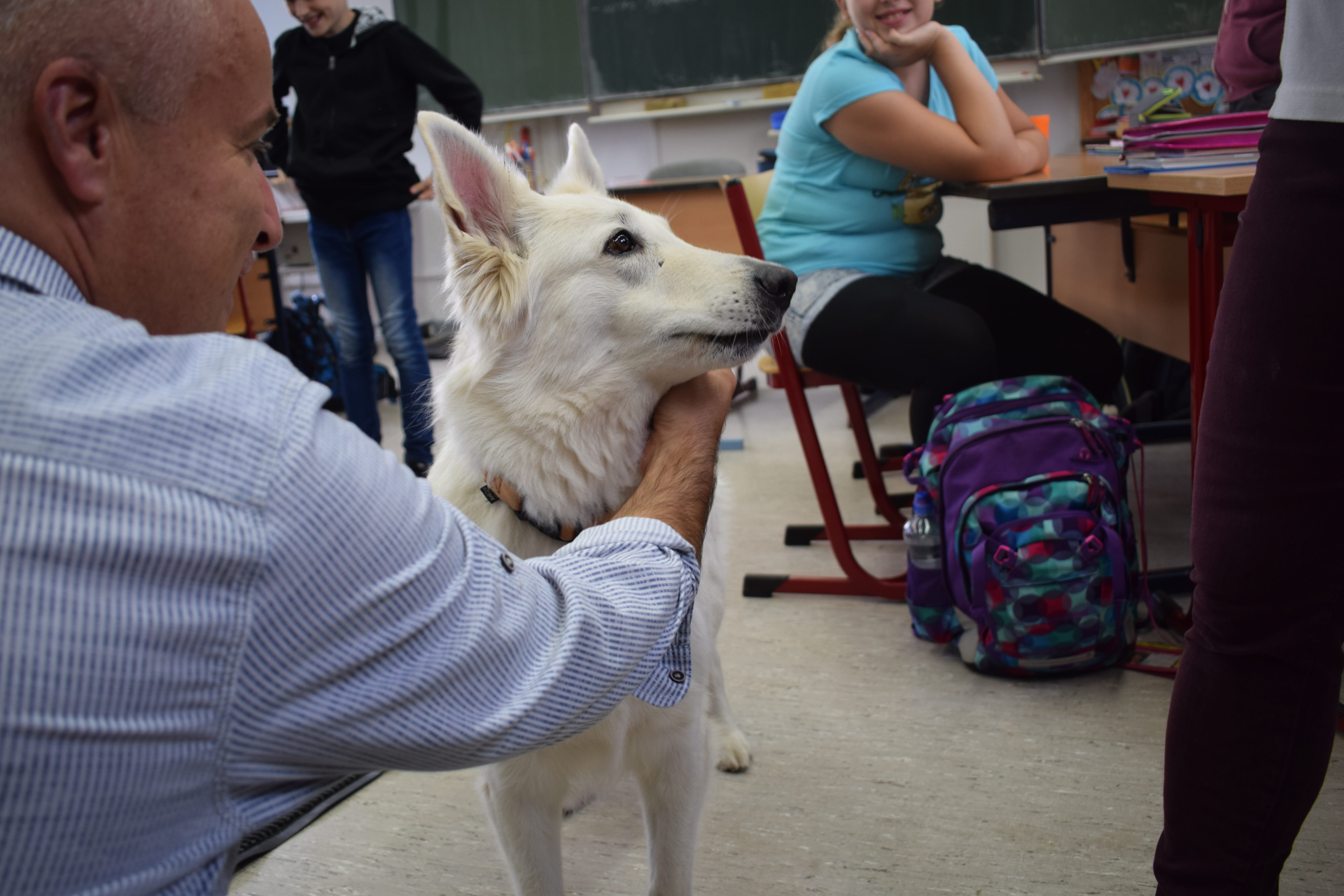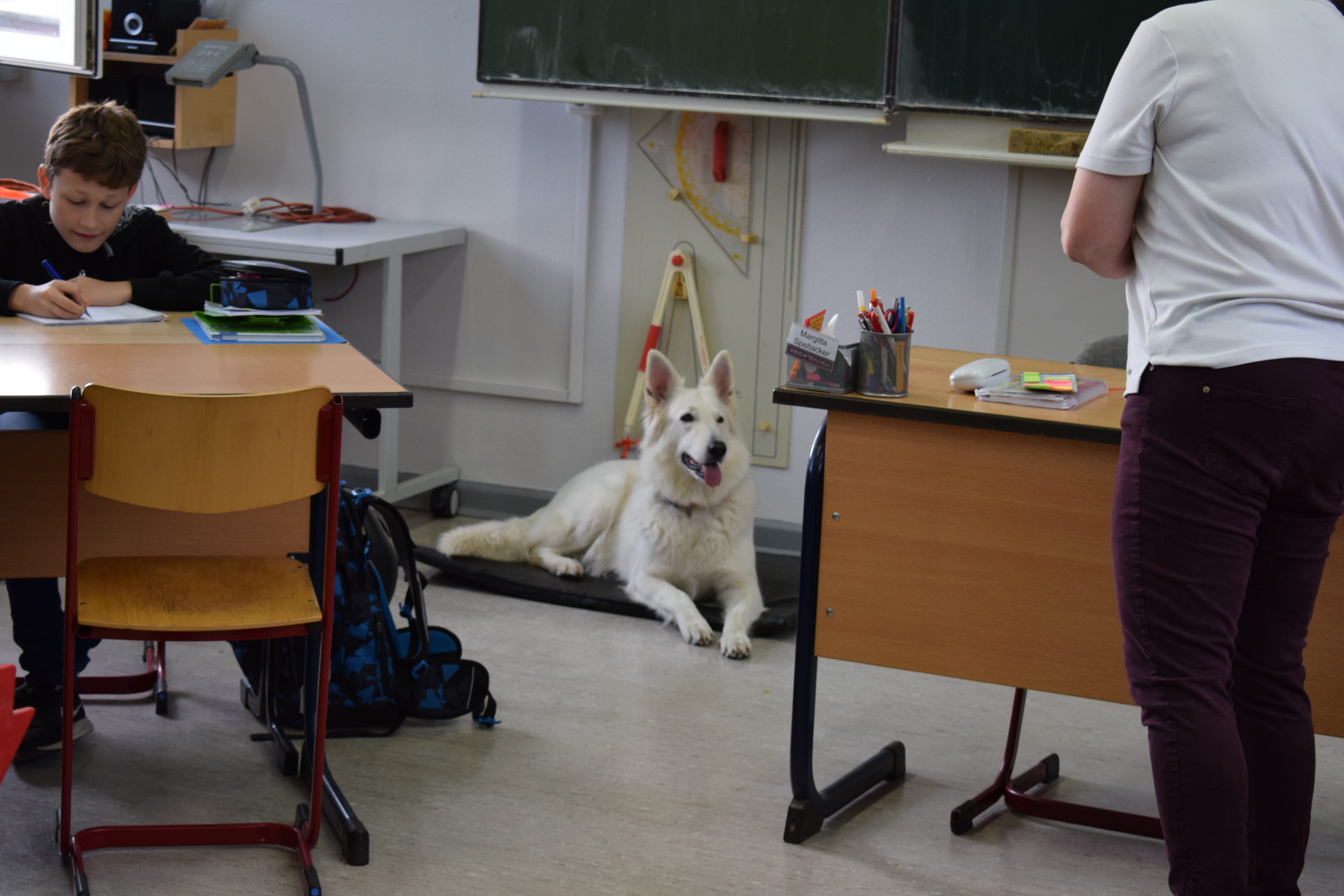 Ich heiße Paula, bin 5 Jahre alt und ein Schweizer Schäferhund. Mein Frauchen und ich haben eine Ausbildung zum Schul- und Therapiehund absolviert. Seit einem Jahr kenne ich meine Klasse und unterstütze sie in NaWi und Mathematik. Englisch haben wir auch schon mal gemacht. Besonders im sozialen Bereich konnte die Klasse 5d (jetzt 6d) viel lernen.