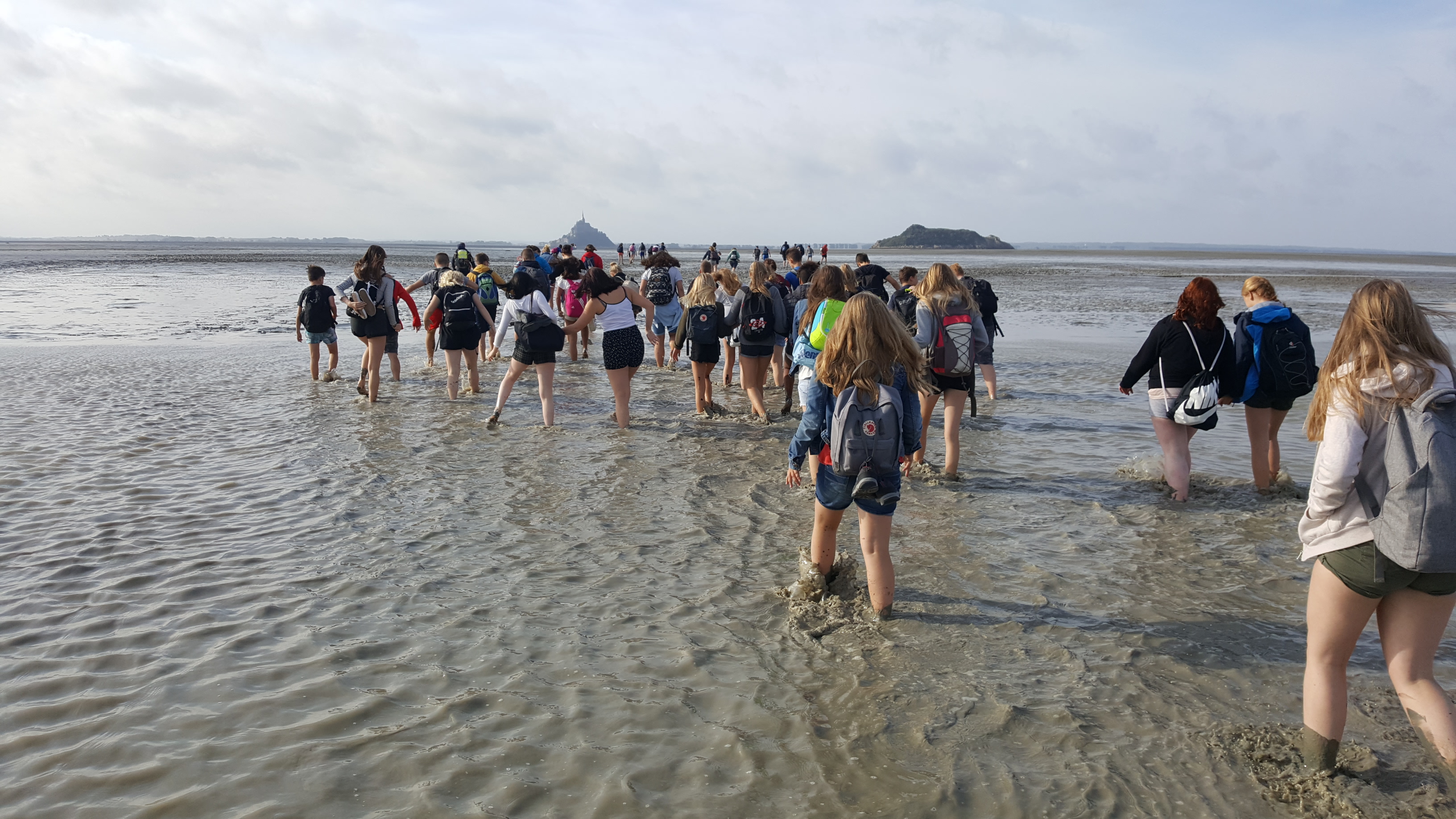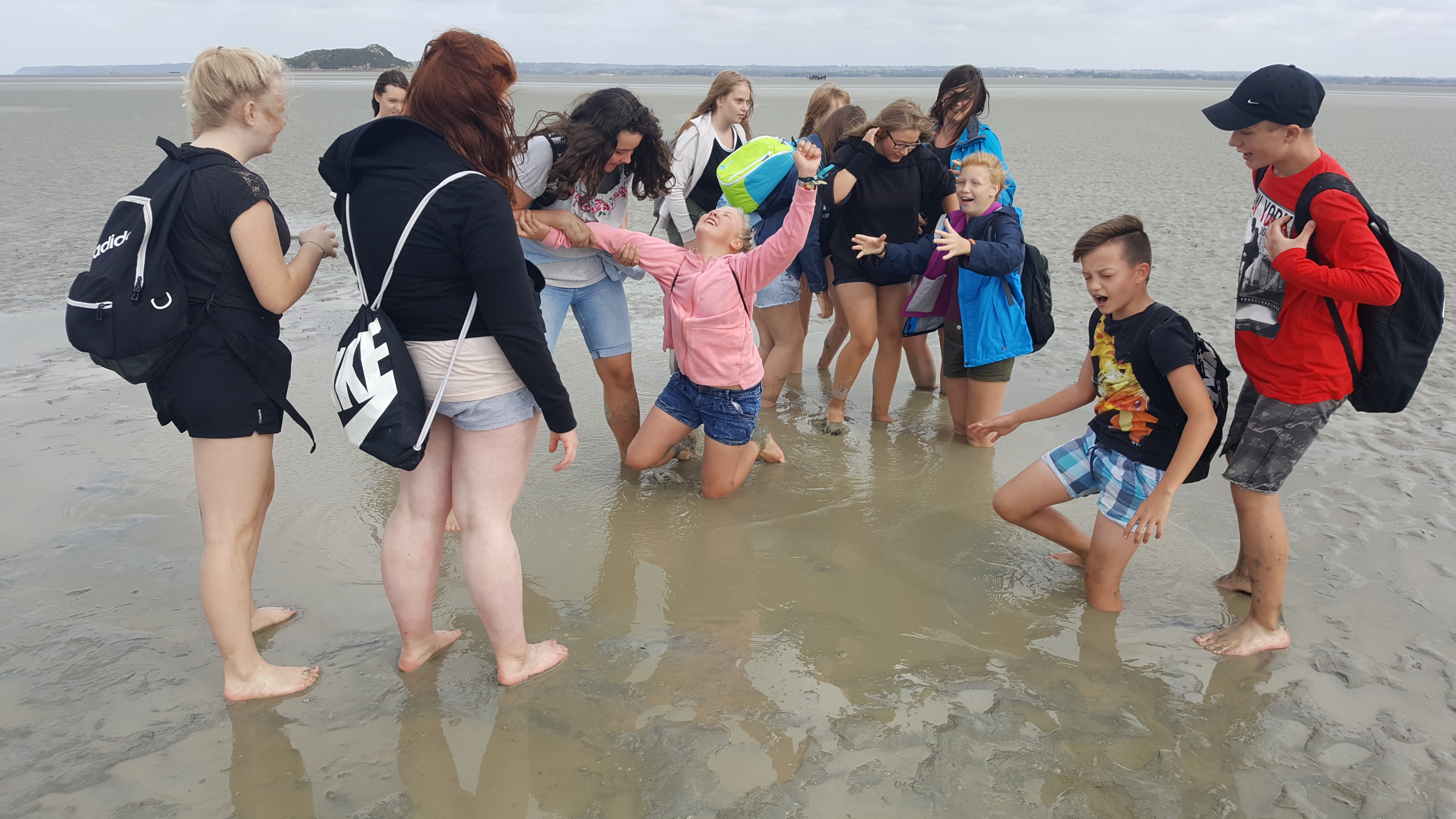vom Bec d'Andaine zum Mont Saint Michel geführt. Es ging durch tiefen Matsch, der angeblich woanders als Thalasso teuer als Packung für die Haut verkauft wird. Wenn es danach geht, haben wir jetzt alle ganz zarte Füße .... Wir durften uns auch bis über die Knie in den Wattboden "eingraben" - nur hat uns keiner gesagt, wie wir wieder herauskommen. Und so mussten alle mithelfen, um die eingesunkenen Beine zu befreien.