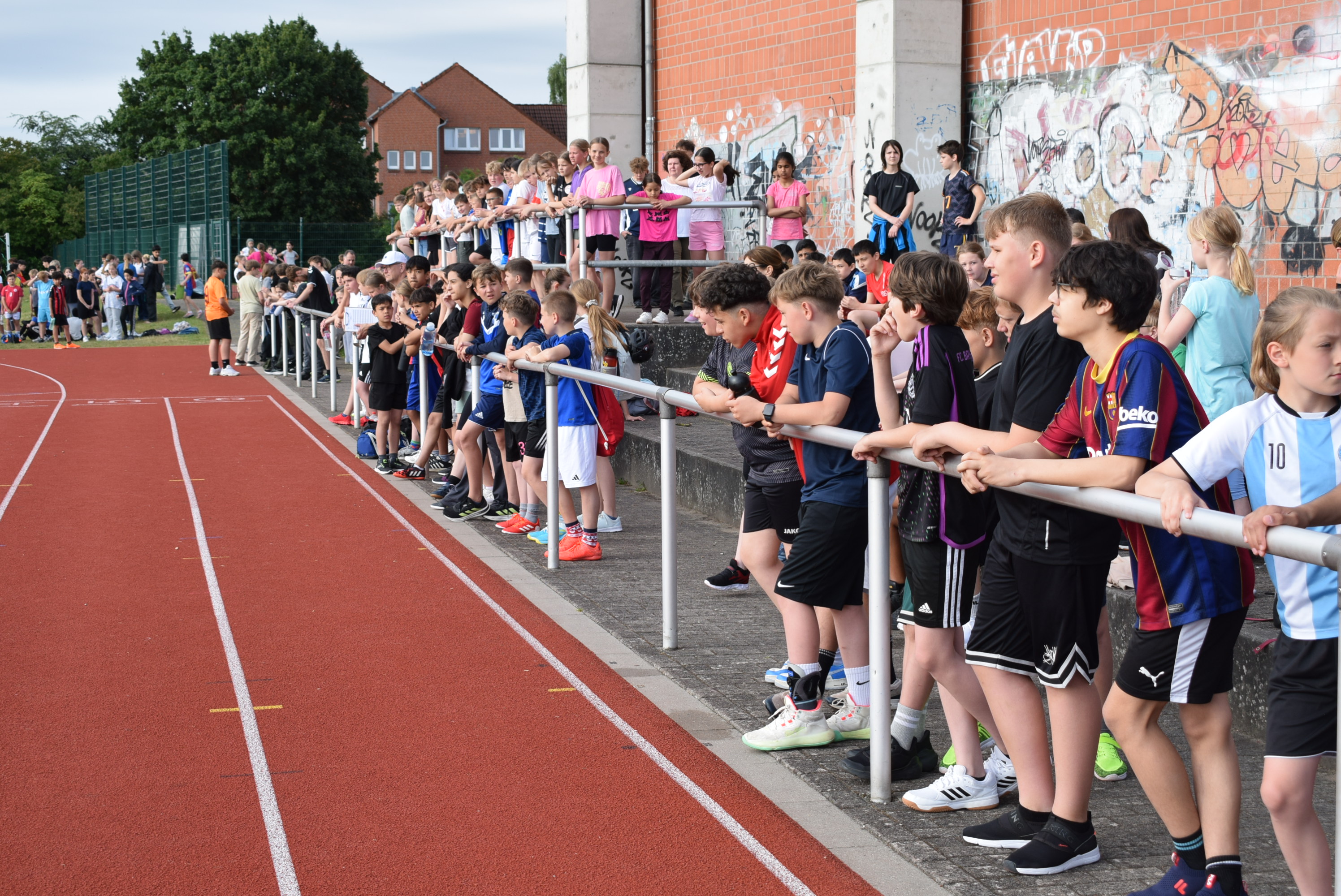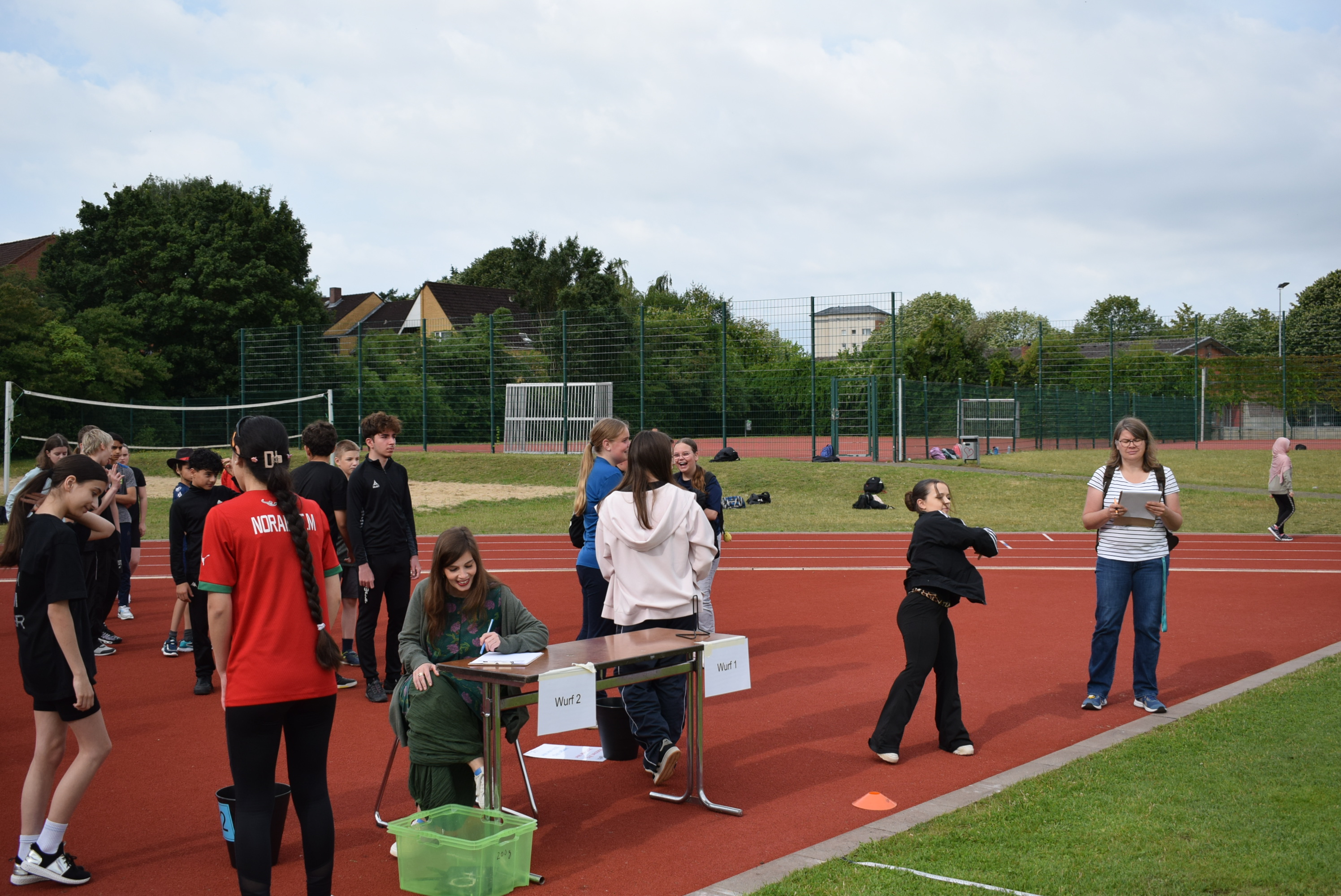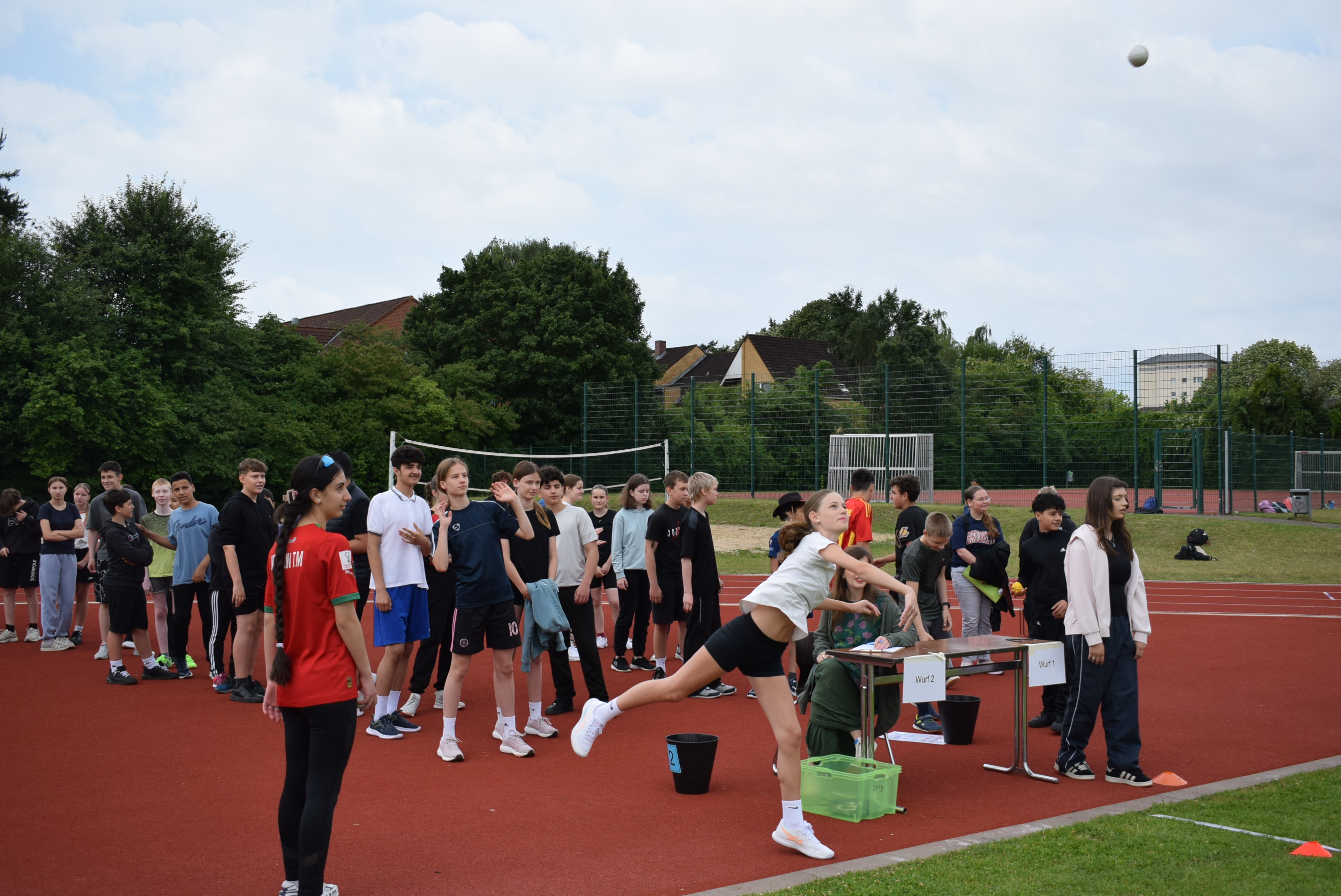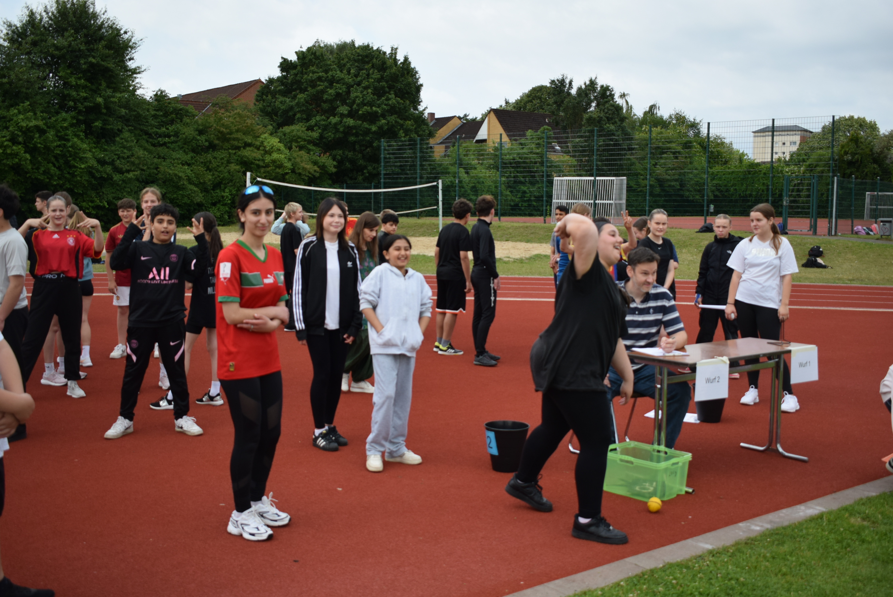 In den Jahrgängen 8-9 wurden die Staffelplatzierungen in den 4x100m Wettkämpfen vergeben, bei dem die zwei schnellsten Jungen und Mädchen der Klasse die Stadionrunde gemeinsam bewältigten. Danach regnete es leider so stark, dass aufgrund der Rutschgefahr auf der Tartanbahn der Dreikampf abgesagt und in den Sportunterricht verlegt werden musste. So ein Pech mit dem Wetter hatten wir lange nicht mehr gehabt! Nichts desto trotz können wir von einem gelungenen Sporttag mit ordentlich Stimmung an der Gemeinschaftsschule sprechen!