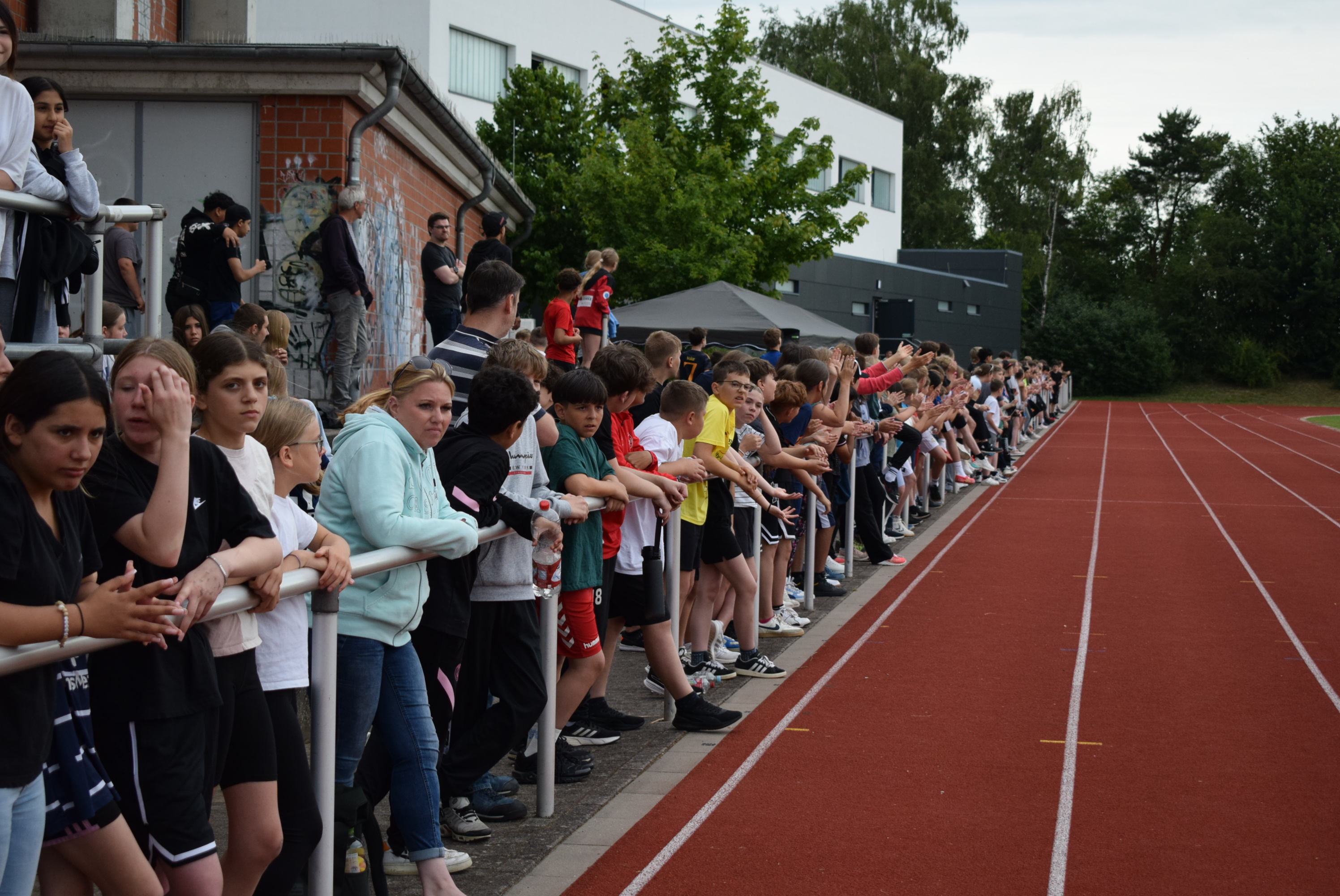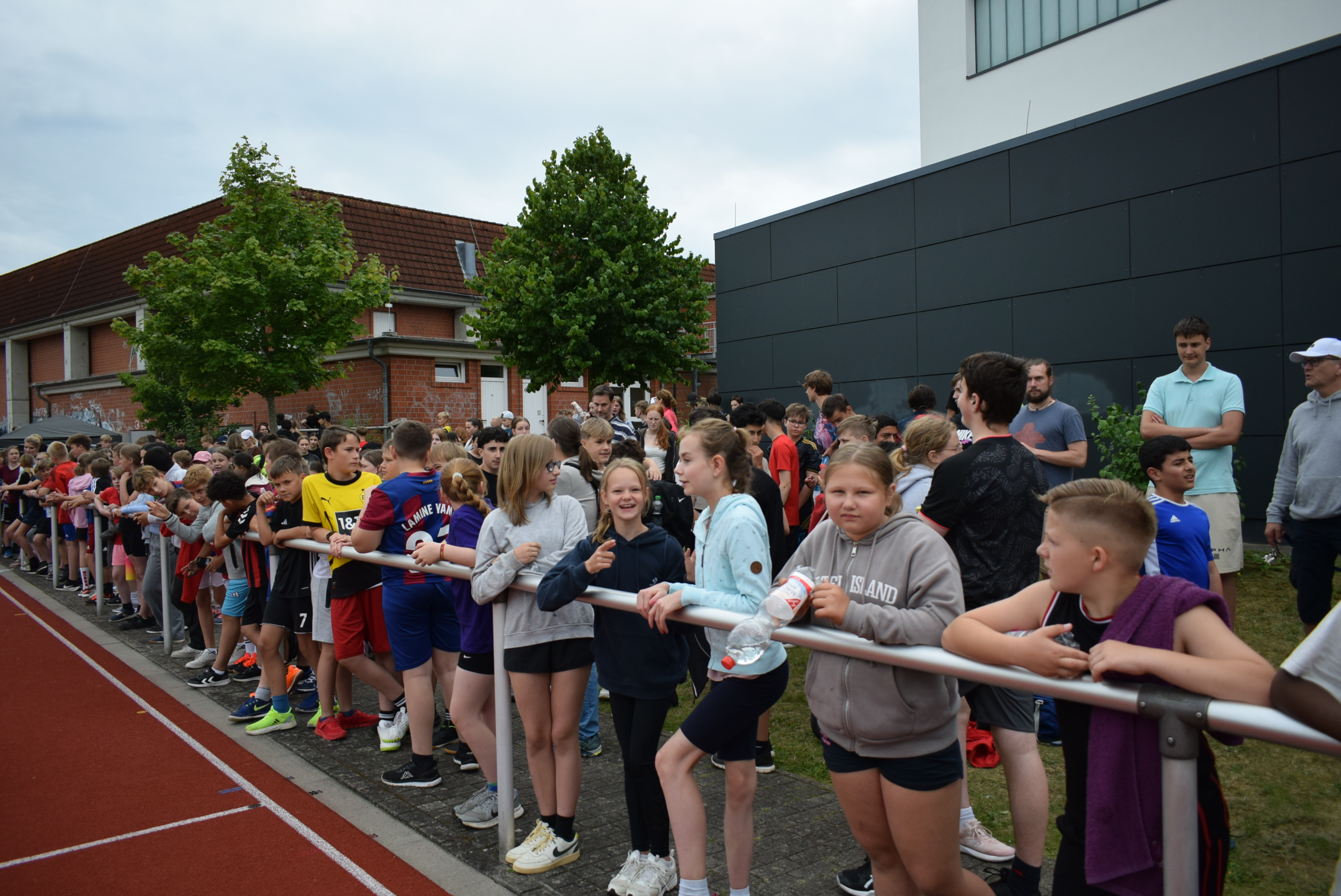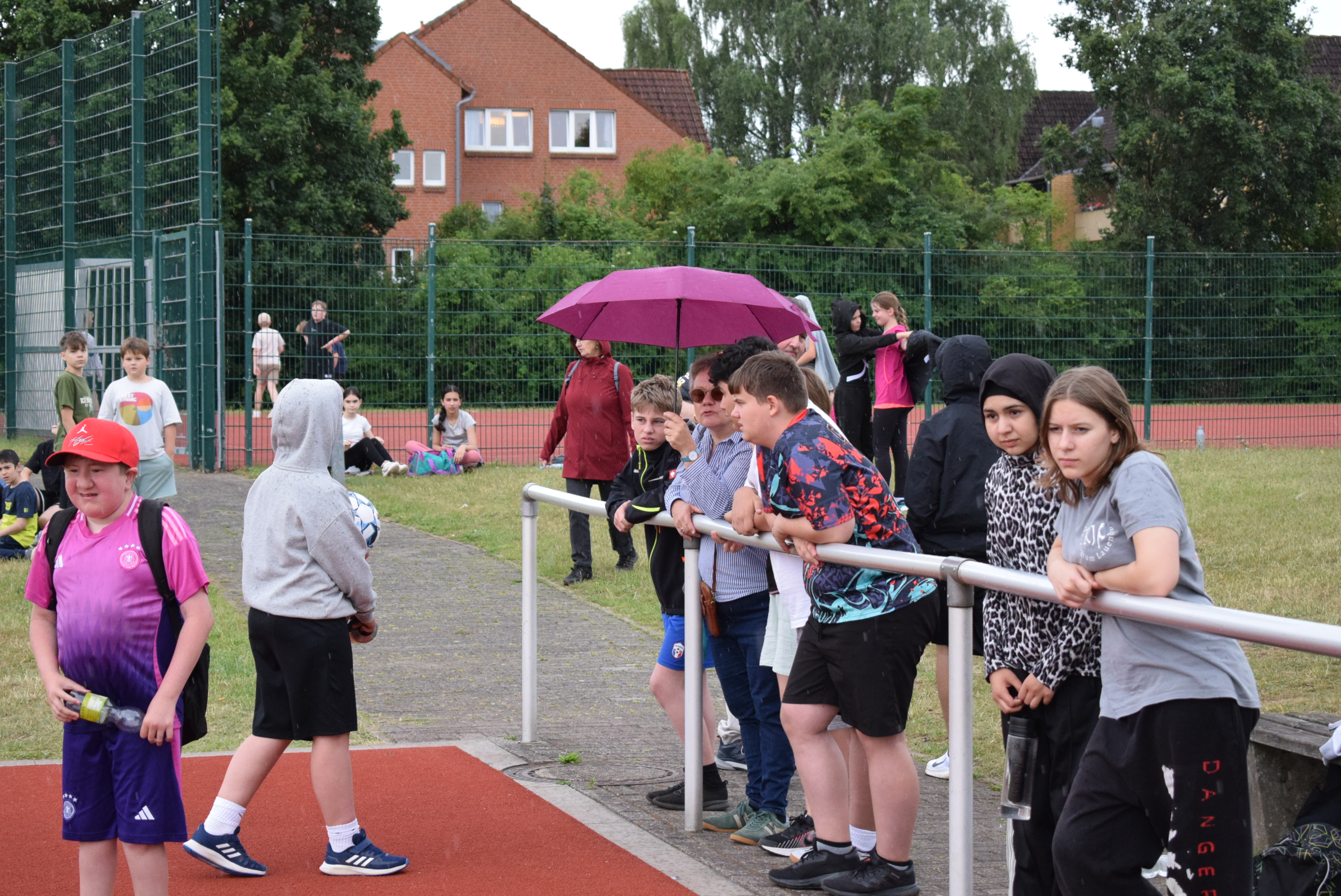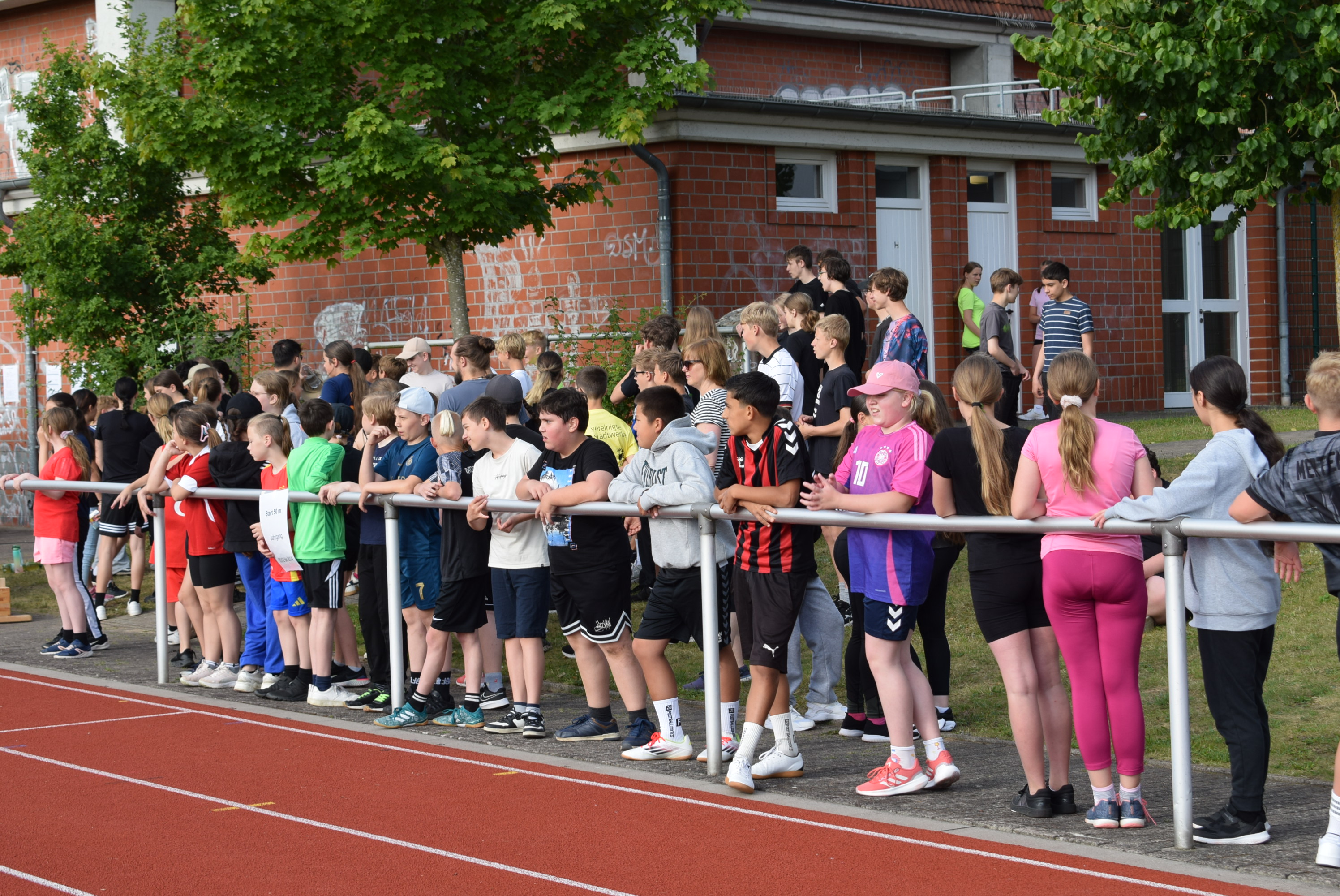 In den Jahrgängen 8-9 wurden die Staffelplatzierungen in den 4x100m Wettkämpfen vergeben, bei dem die zwei schnellsten Jungen und Mädchen der Klasse die Stadionrunde gemeinsam bewältigten. Danach regnete es leider so stark, dass aufgrund der Rutschgefahr auf der Tartanbahn der Dreikampf abgesagt und in den Sportunterricht verlegt werden musste. So ein Pech mit dem Wetter hatten wir lange nicht mehr gehabt! Nichts desto trotz können wir von einem gelungenen Sporttag mit ordentlich Stimmung an der Gemeinschaftsschule sprechen!