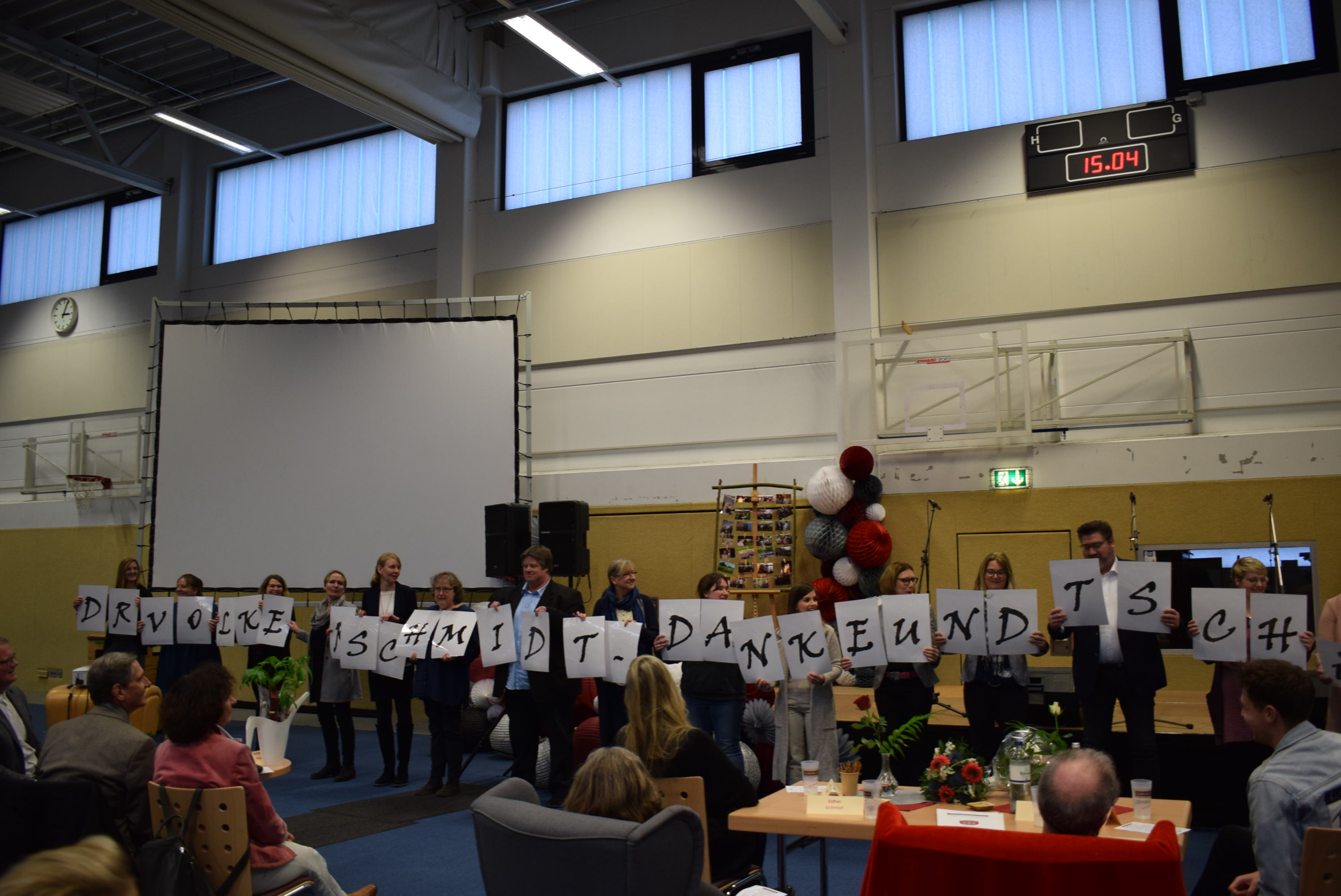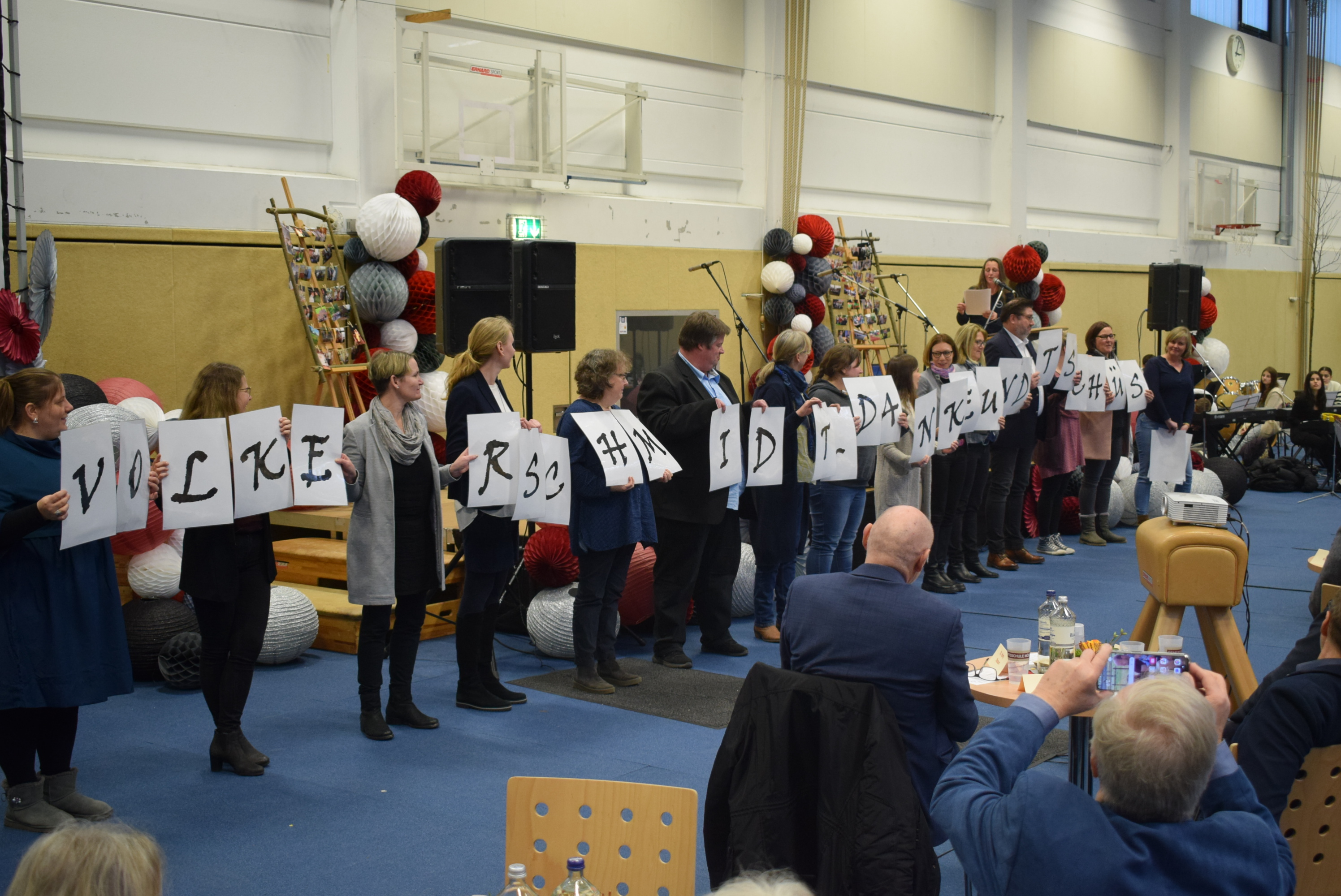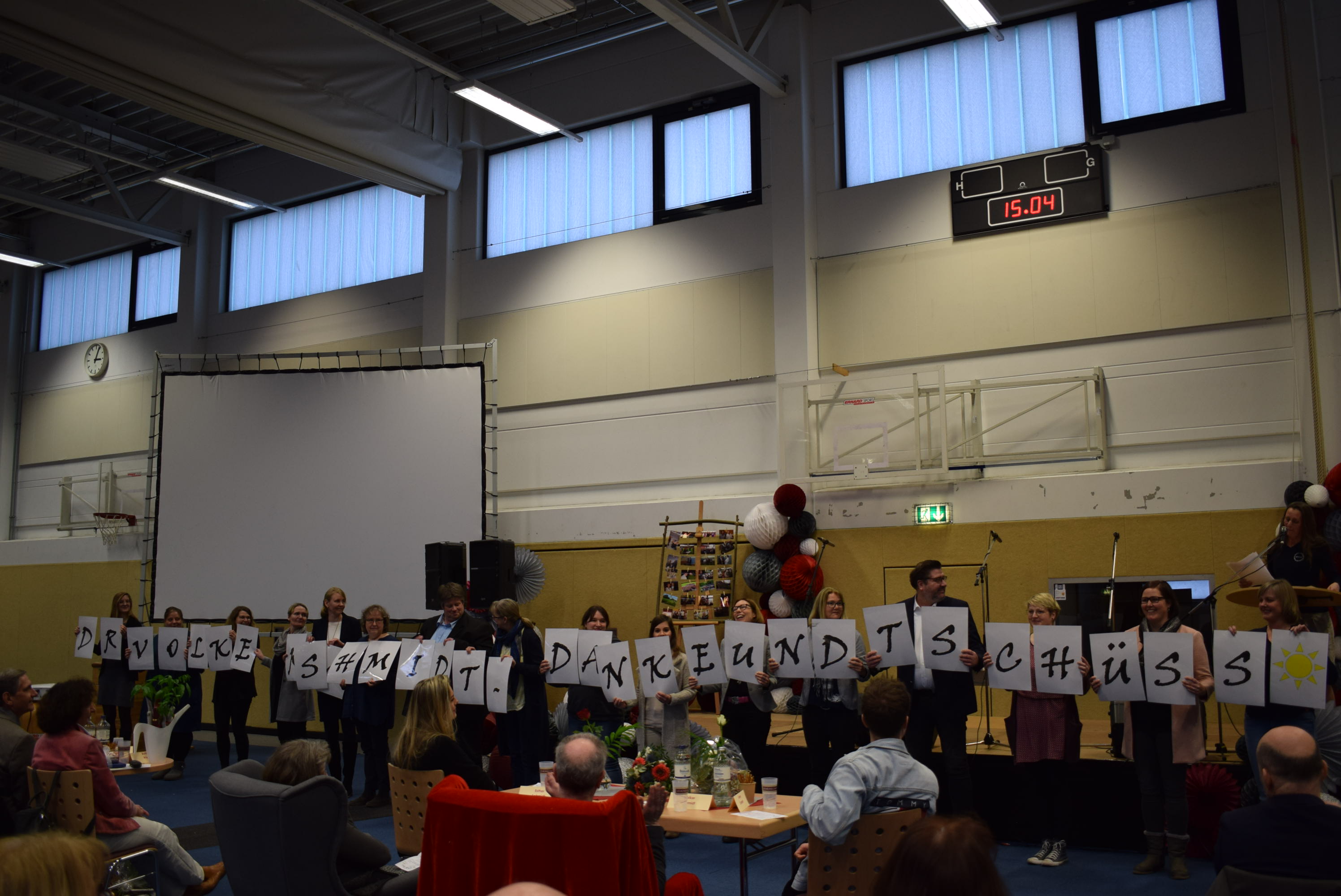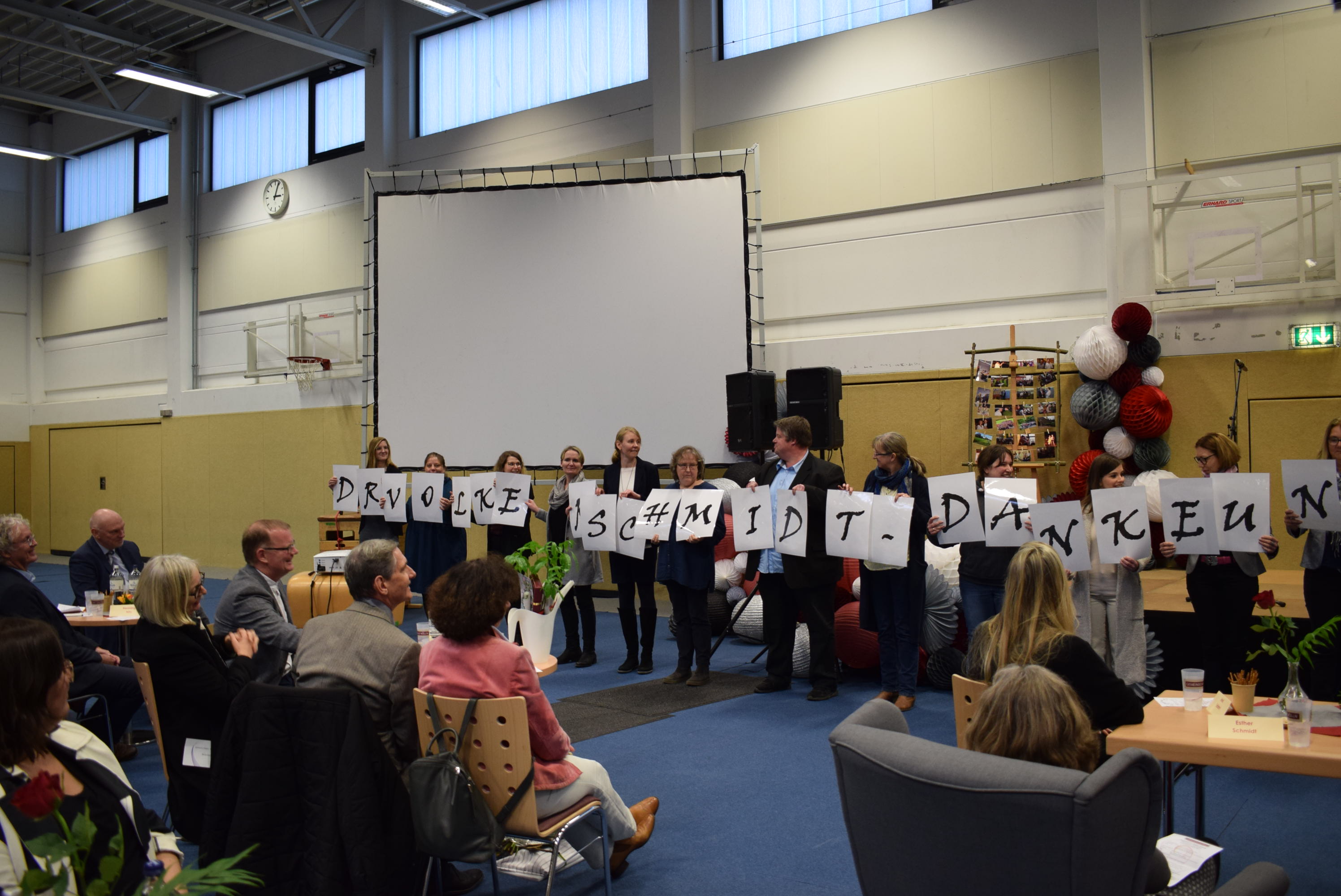 Am Schluss der Veranstaltung sang die ganze Schüler- und Lehrerschaft zur Melodie „Ode an die Freude“ („Freude schöner Götterfunken“) einen Abschiedsgruß für Herrn Dr. Schmidt, der damit endete, dass jeder eine Papiertüte zum Platzen brachte, um den Schlusspunkt zu symbolisieren.