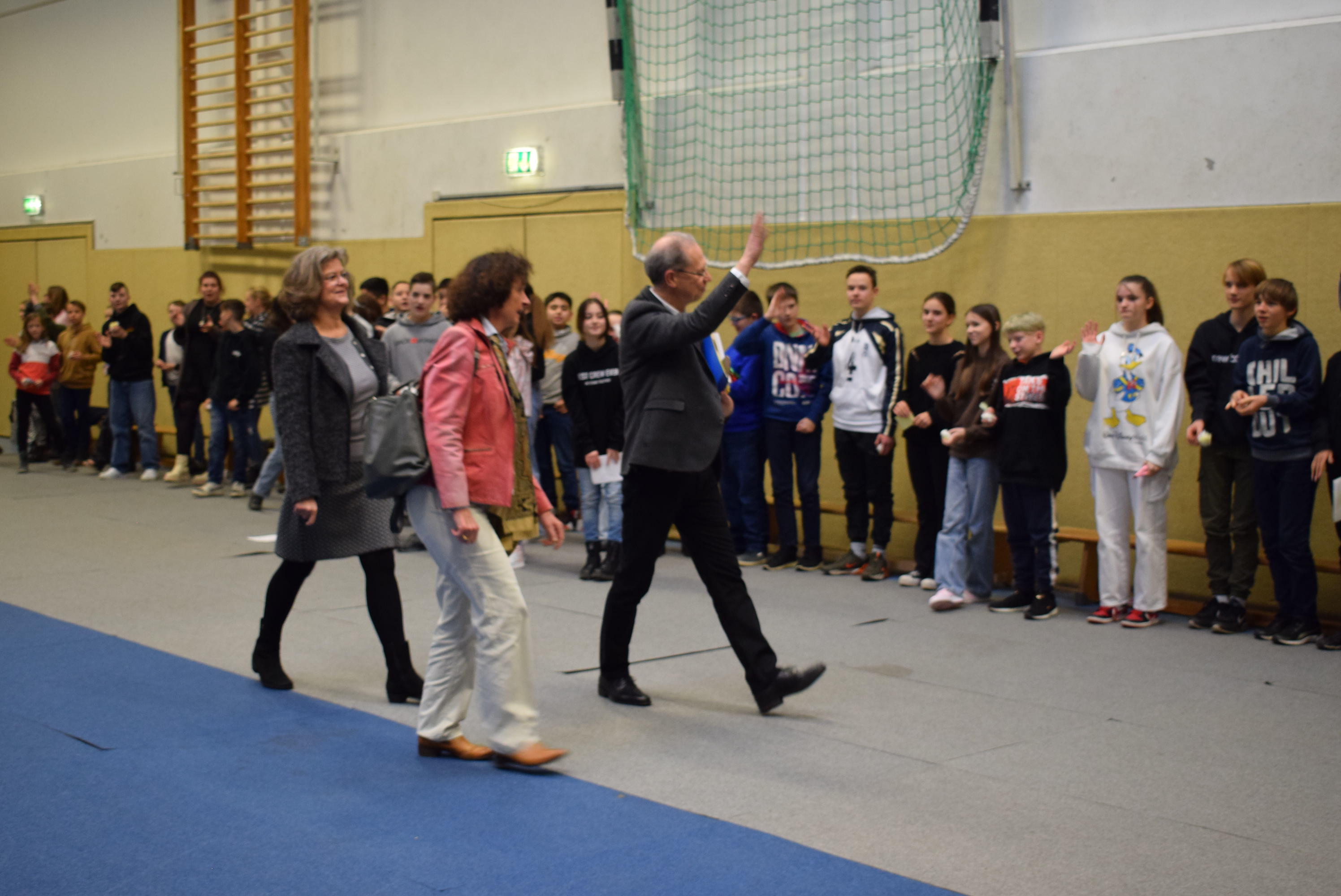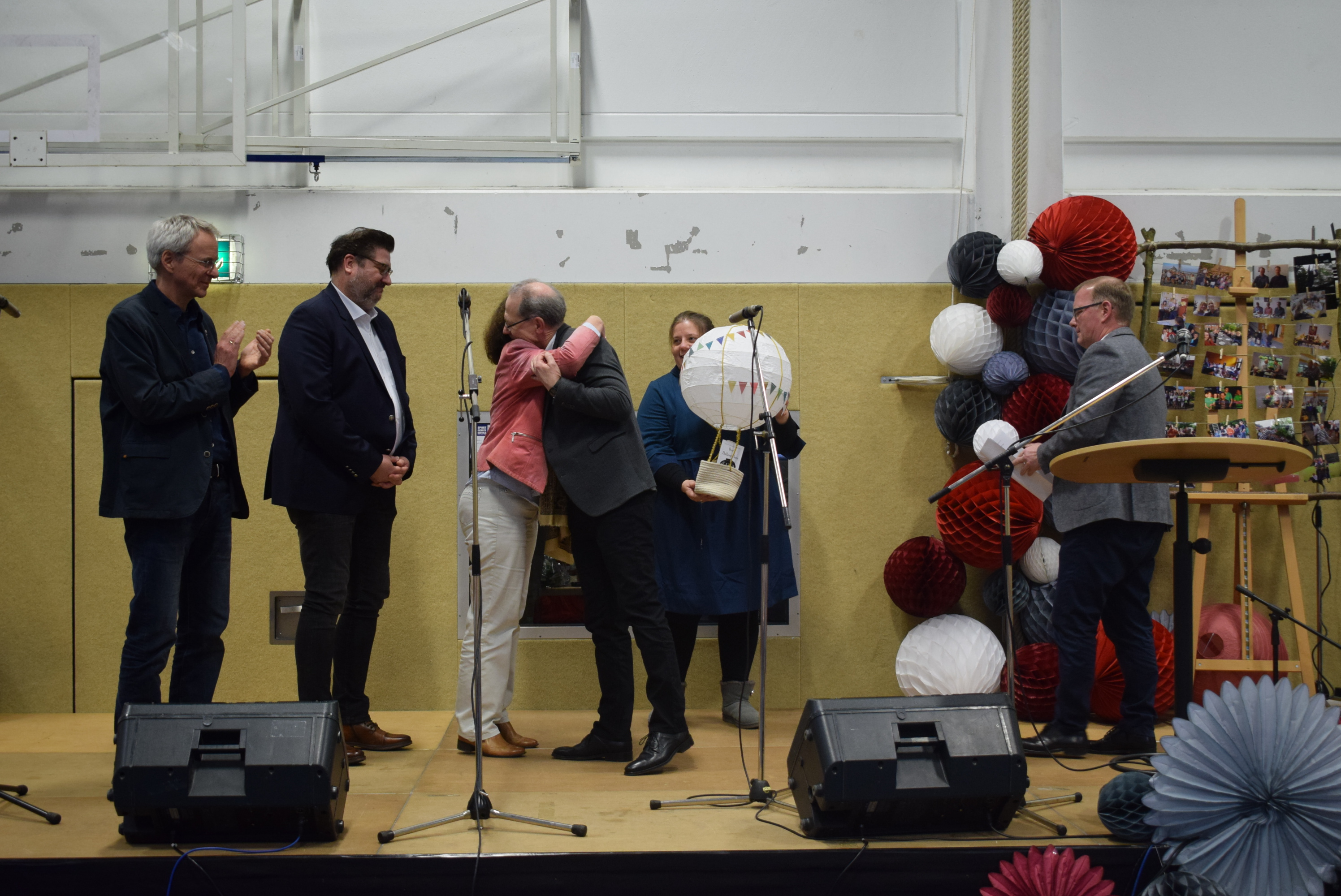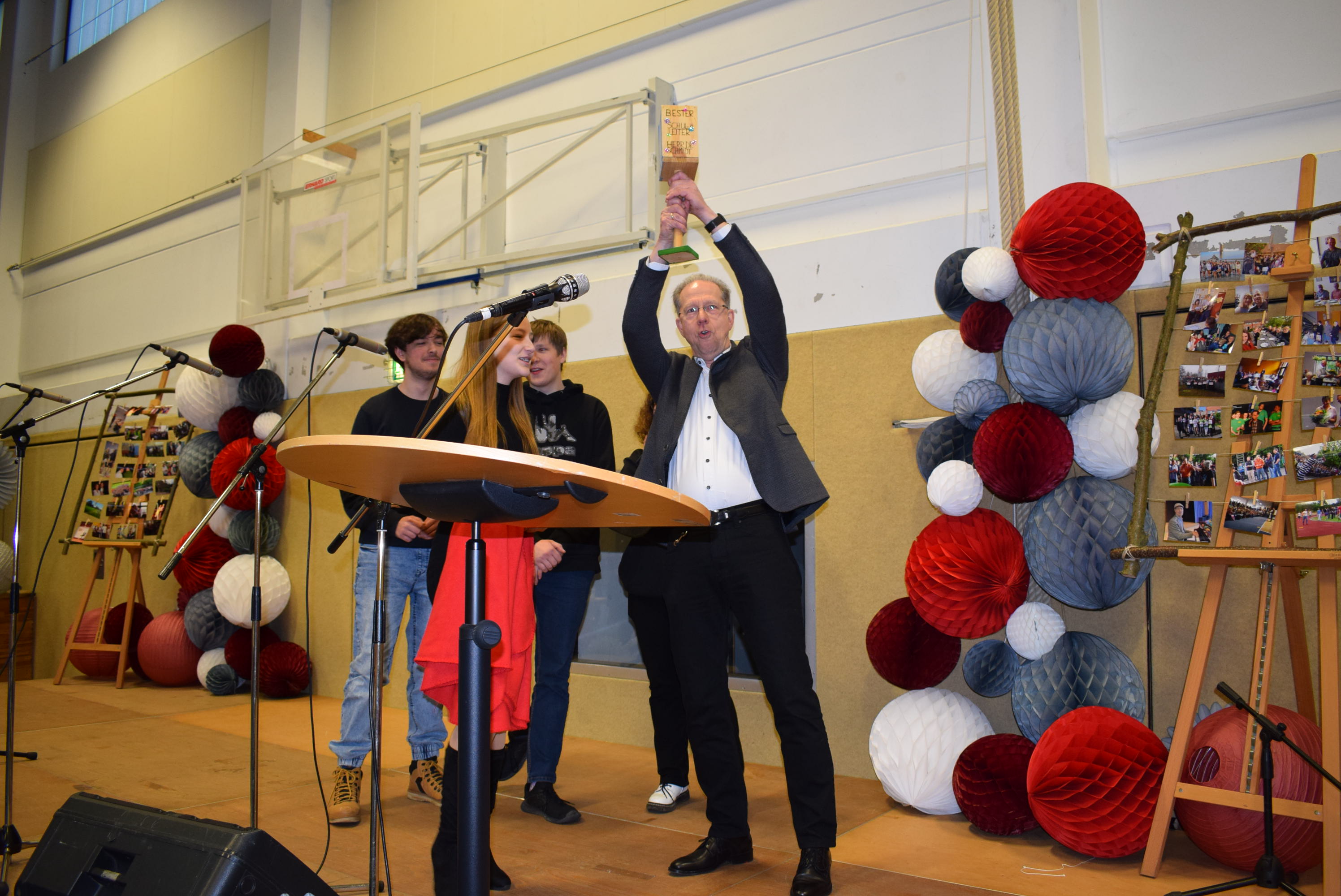 Am Schluss der Veranstaltung sang die ganze Schüler- und Lehrerschaft zur Melodie „Ode an die Freude“ („Freude schöner Götterfunken“) einen Abschiedsgruß für Herrn Dr. Schmidt, der damit endete, dass jeder eine Papiertüte zum Platzen brachte, um den Schlusspunkt zu symbolisieren.