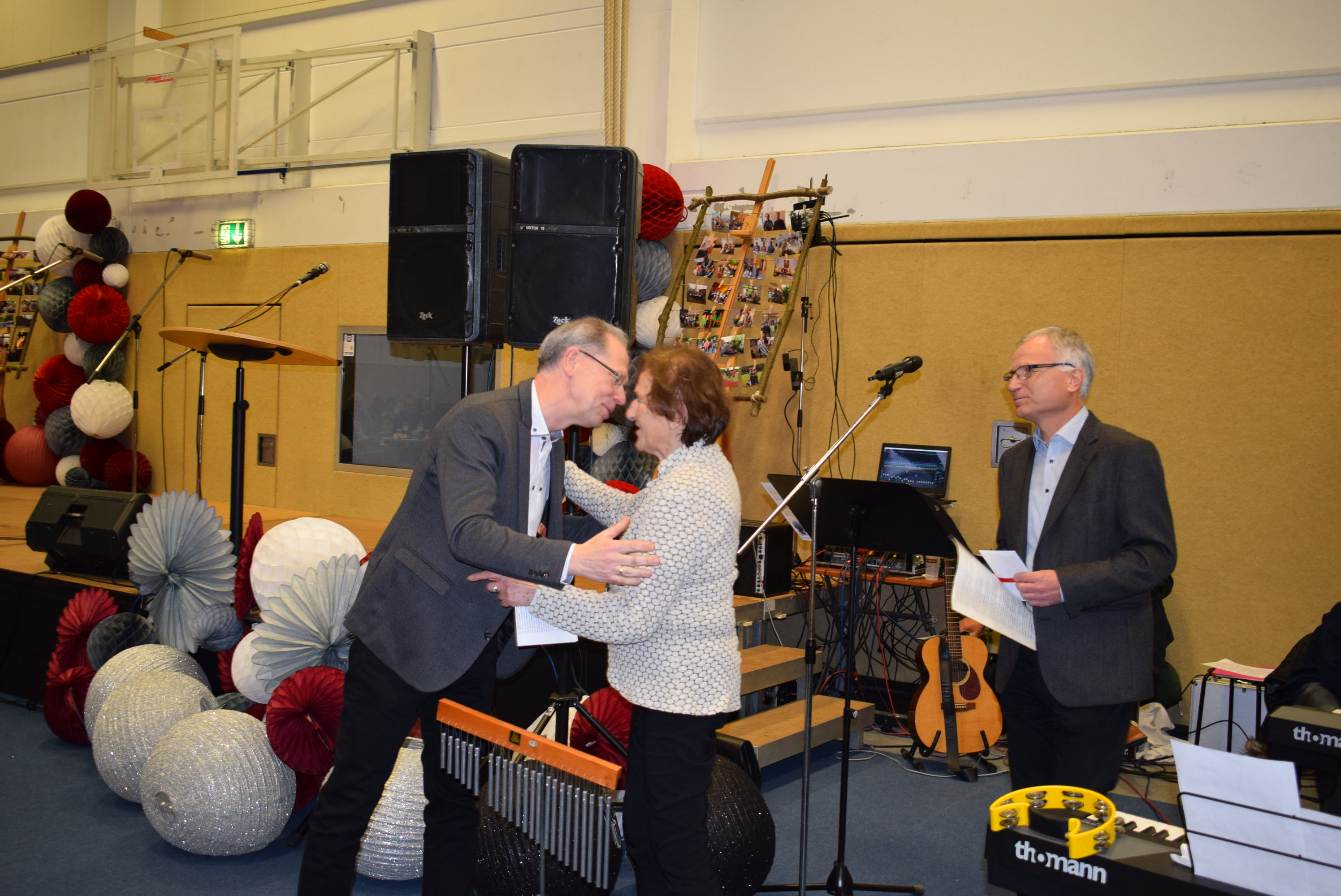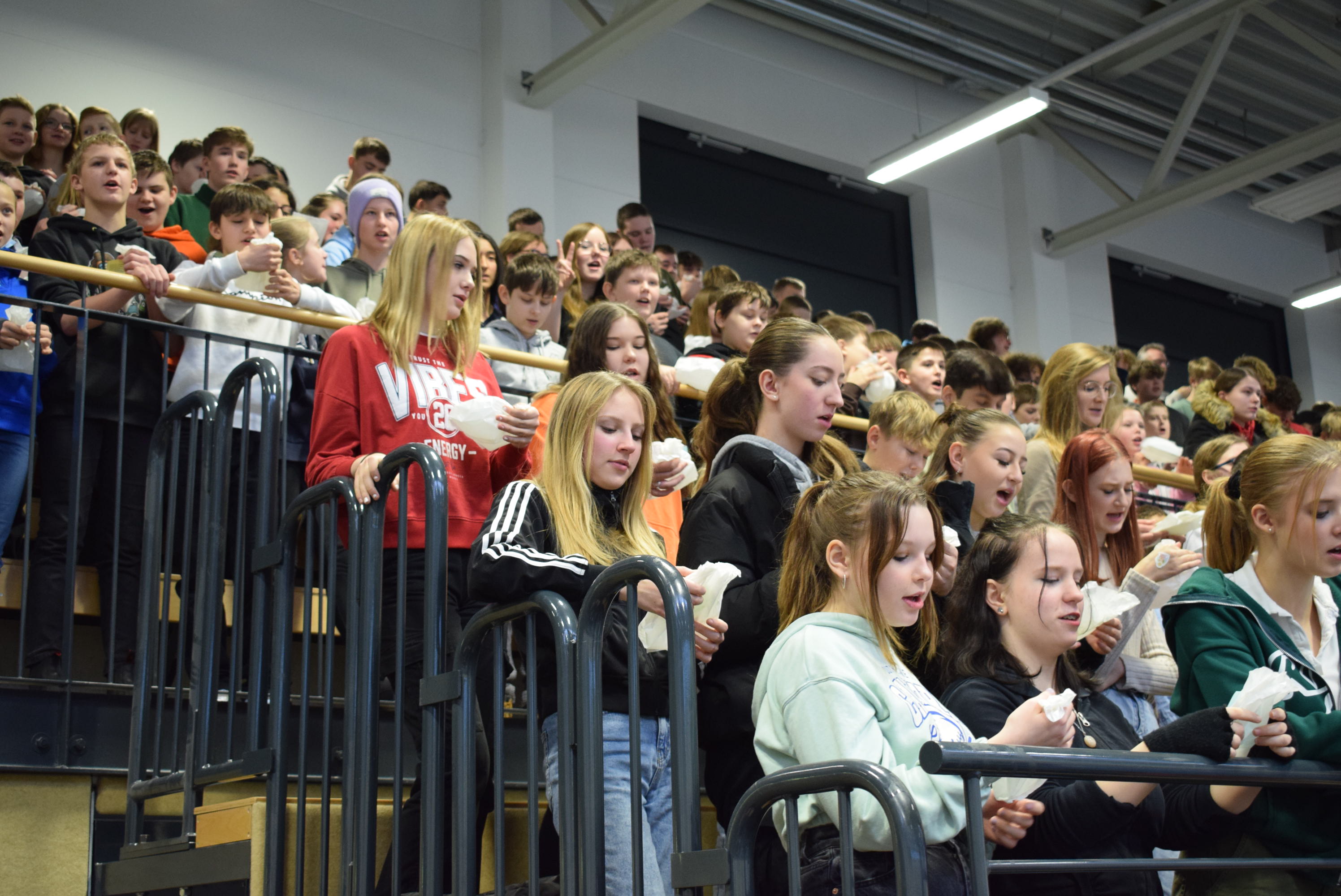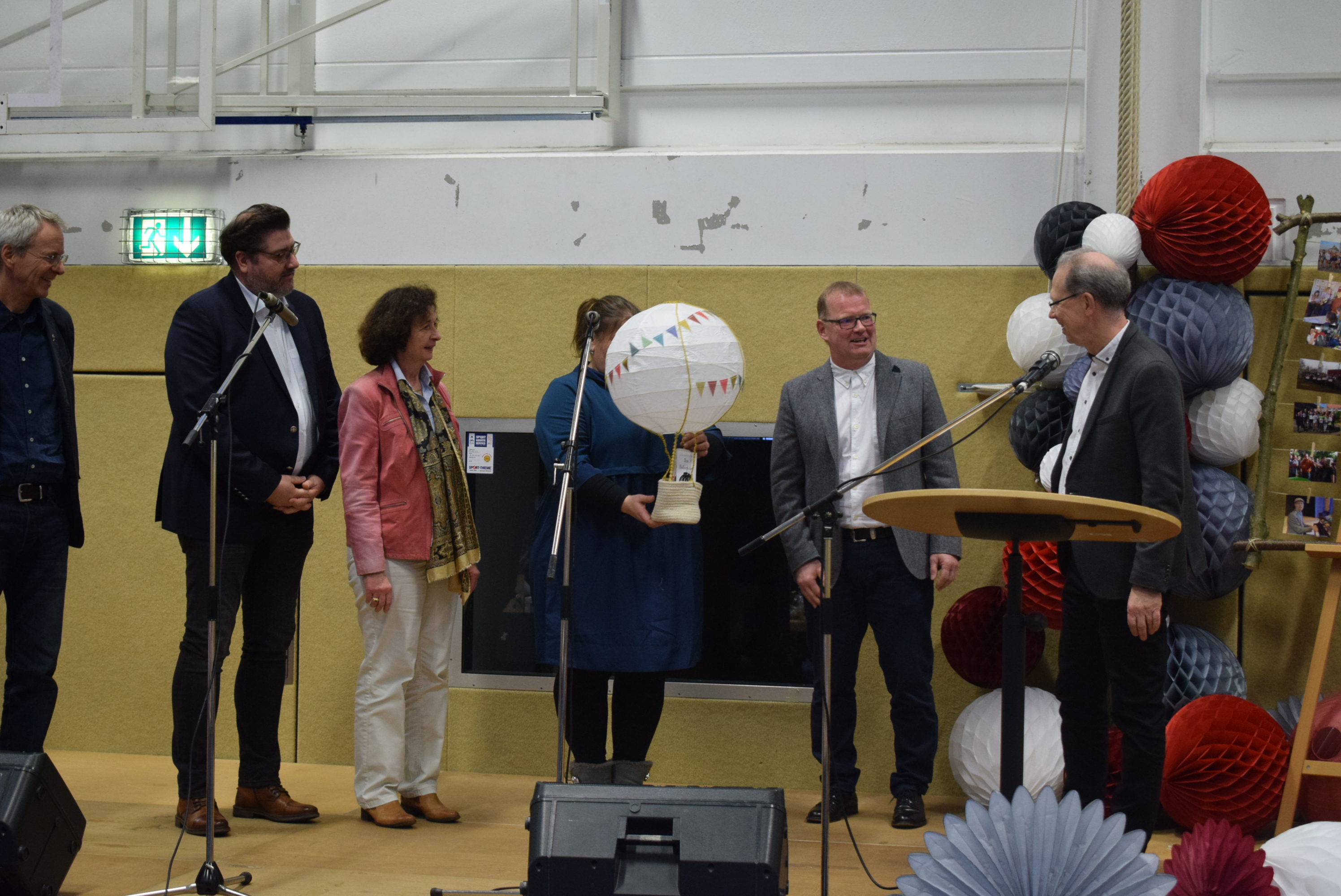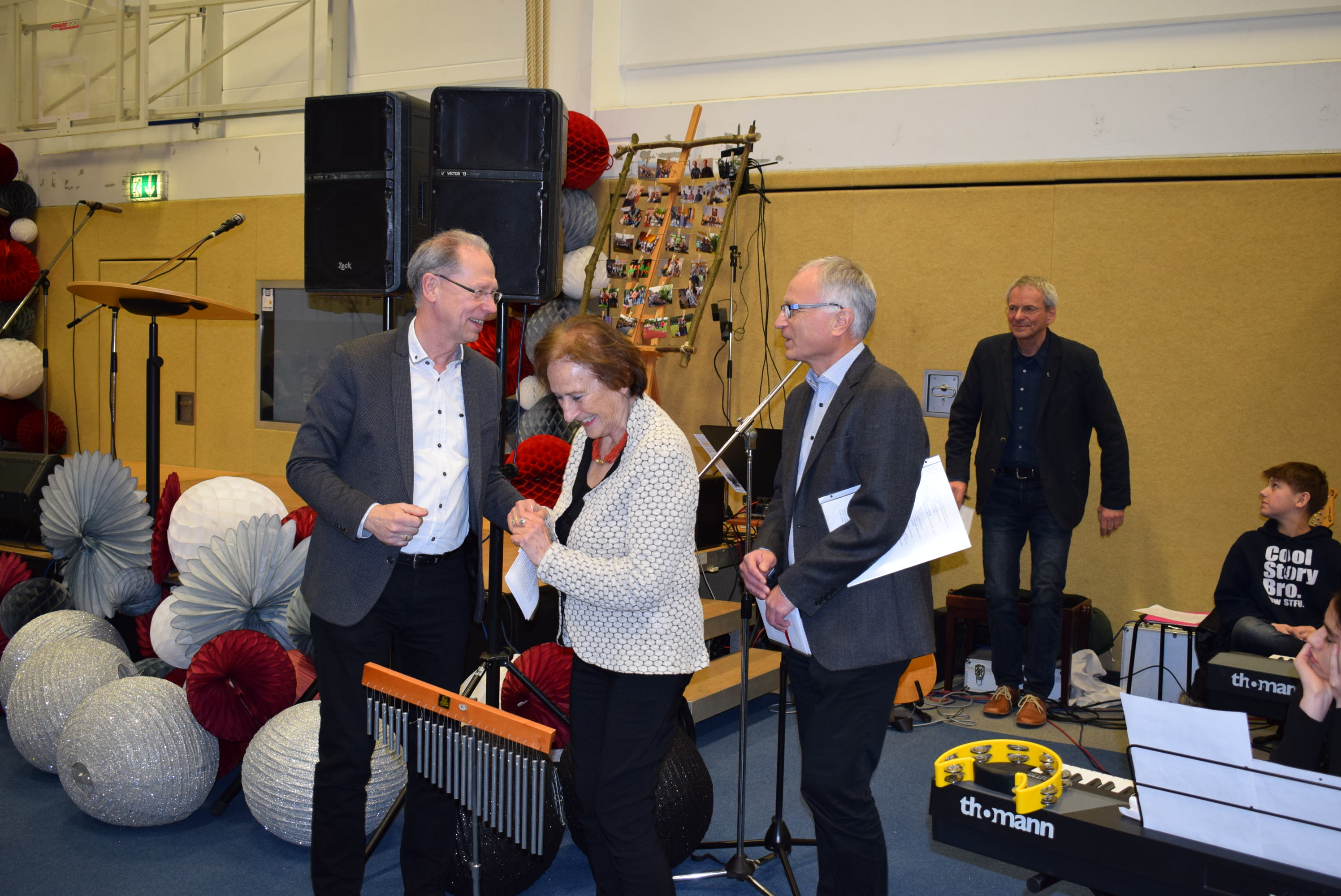 Am Schluss der Veranstaltung sang die ganze Schüler- und Lehrerschaft zur Melodie „Ode an die Freude“ („Freude schöner Götterfunken“) einen Abschiedsgruß für Herrn Dr. Schmidt, der damit endete, dass jeder eine Papiertüte zum Platzen brachte, um den Schlusspunkt zu symbolisieren.